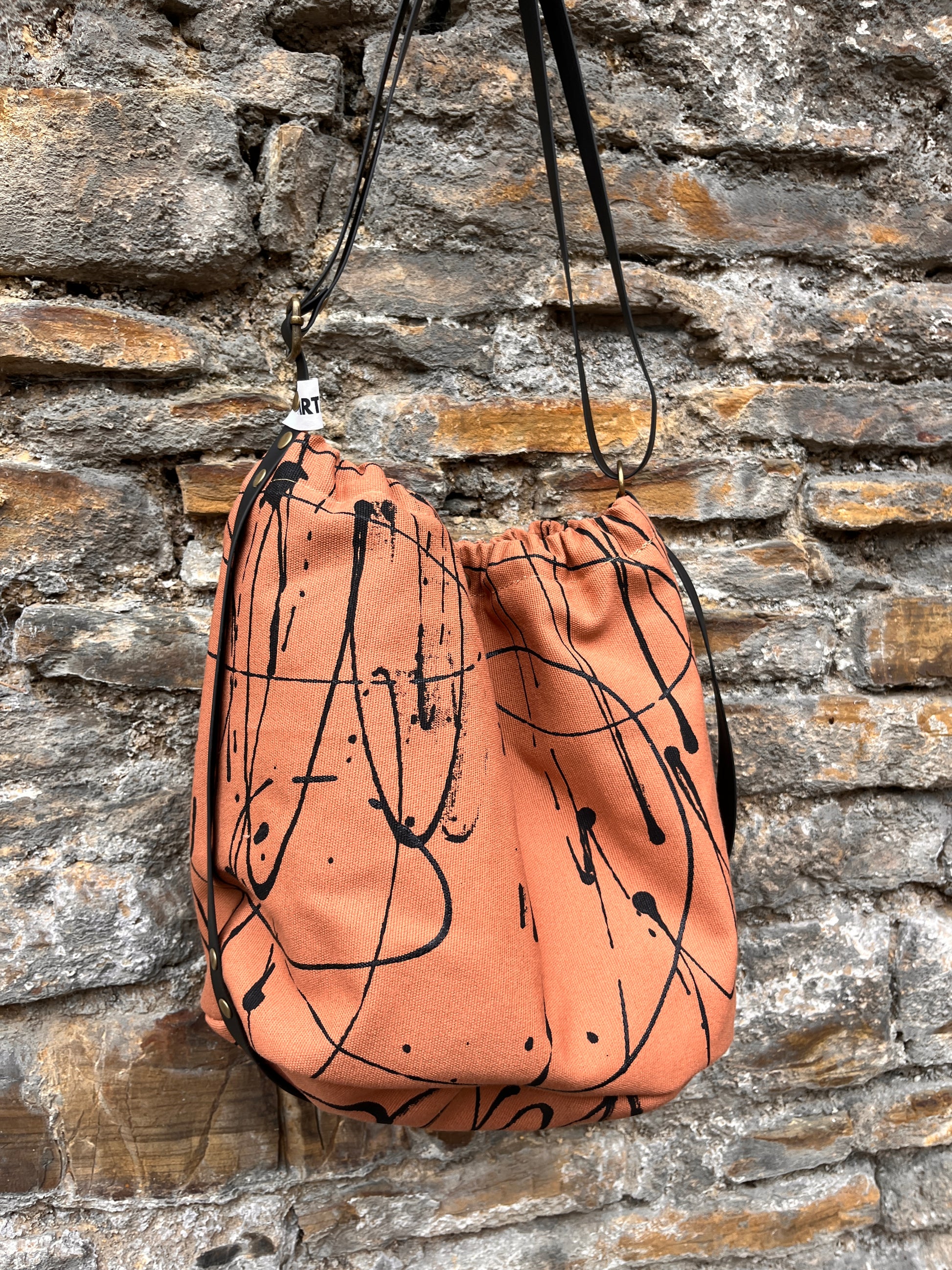 Está pintado a mano sobre algodón orgánico, con un diseño único. Su forma se define gracias a una goma interior que frunce suavemente el tejido, y se cierra con un botón de color oro viejo. La tira larga, que envuelve todo el bolso, es ajustable para que lo lleves como te resulte más cómodo.