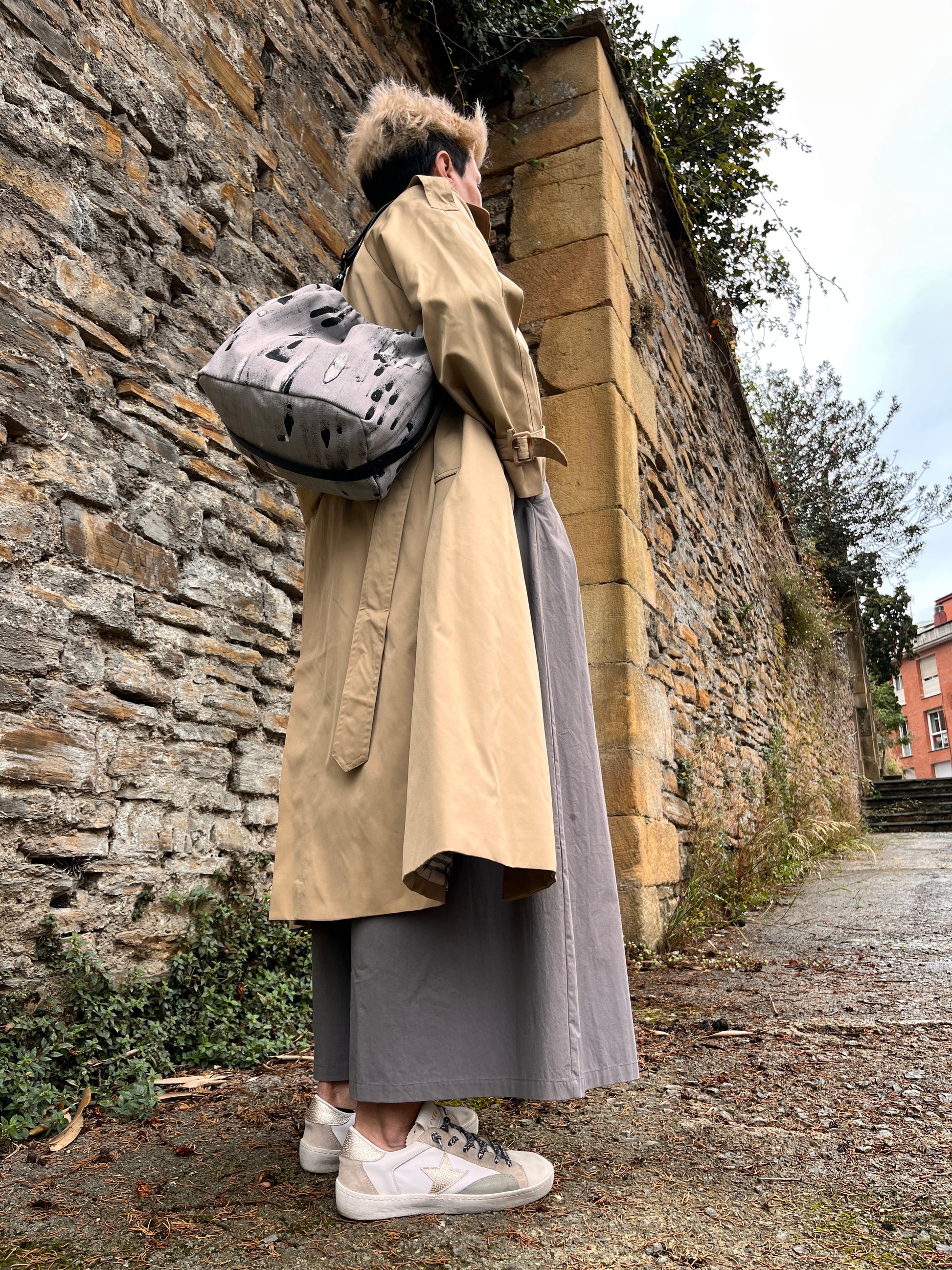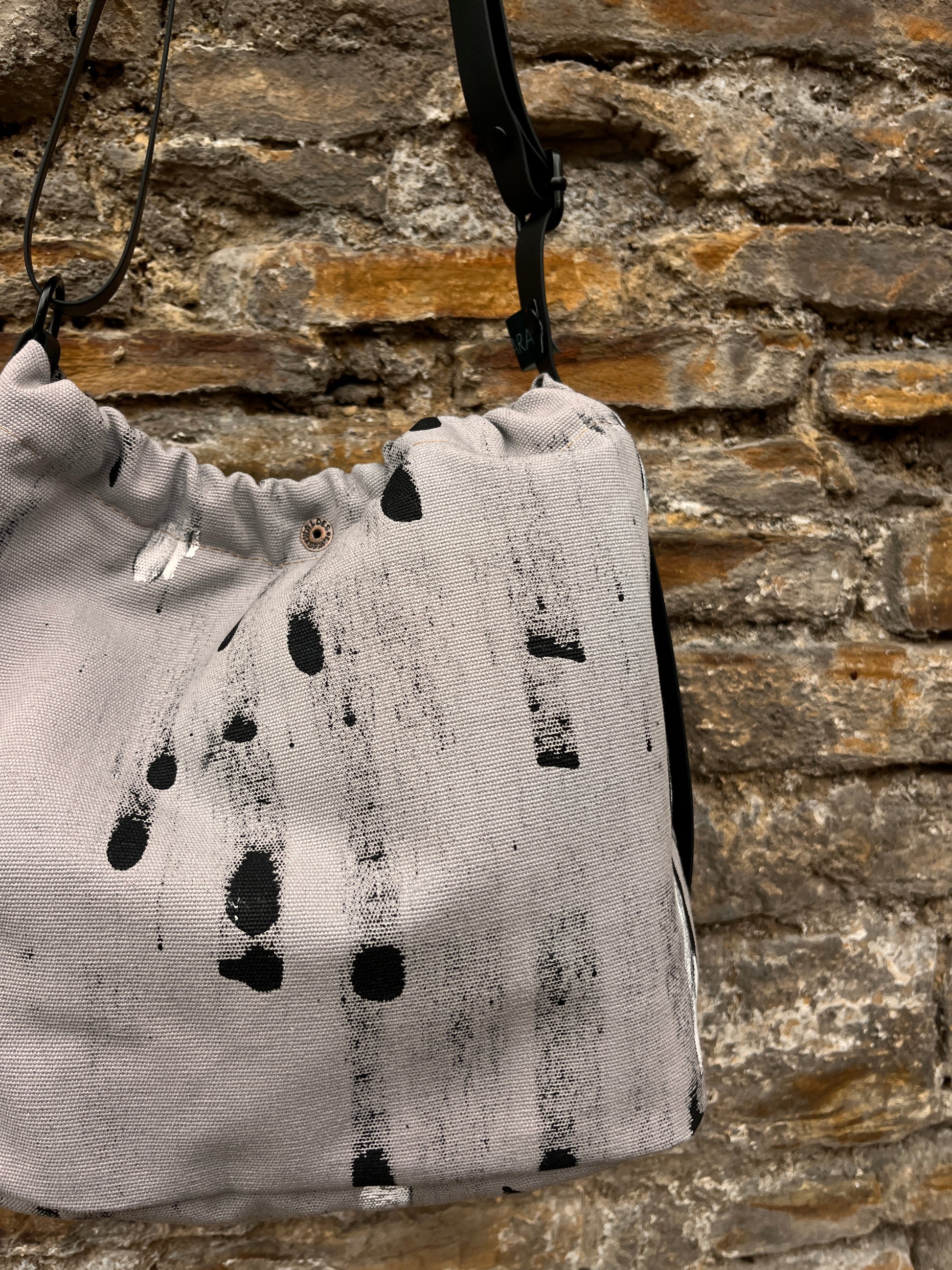 Está pintado a mano sobre algodón orgánico, con un diseño único. Su forma se define gracias a una goma interior que frunce suavemente el tejido, y se cierra con un botón de color oro viejo. La tira larga, que envuelve todo el bolso, es ajustable para que lo lleves como te resulte más cómodo.