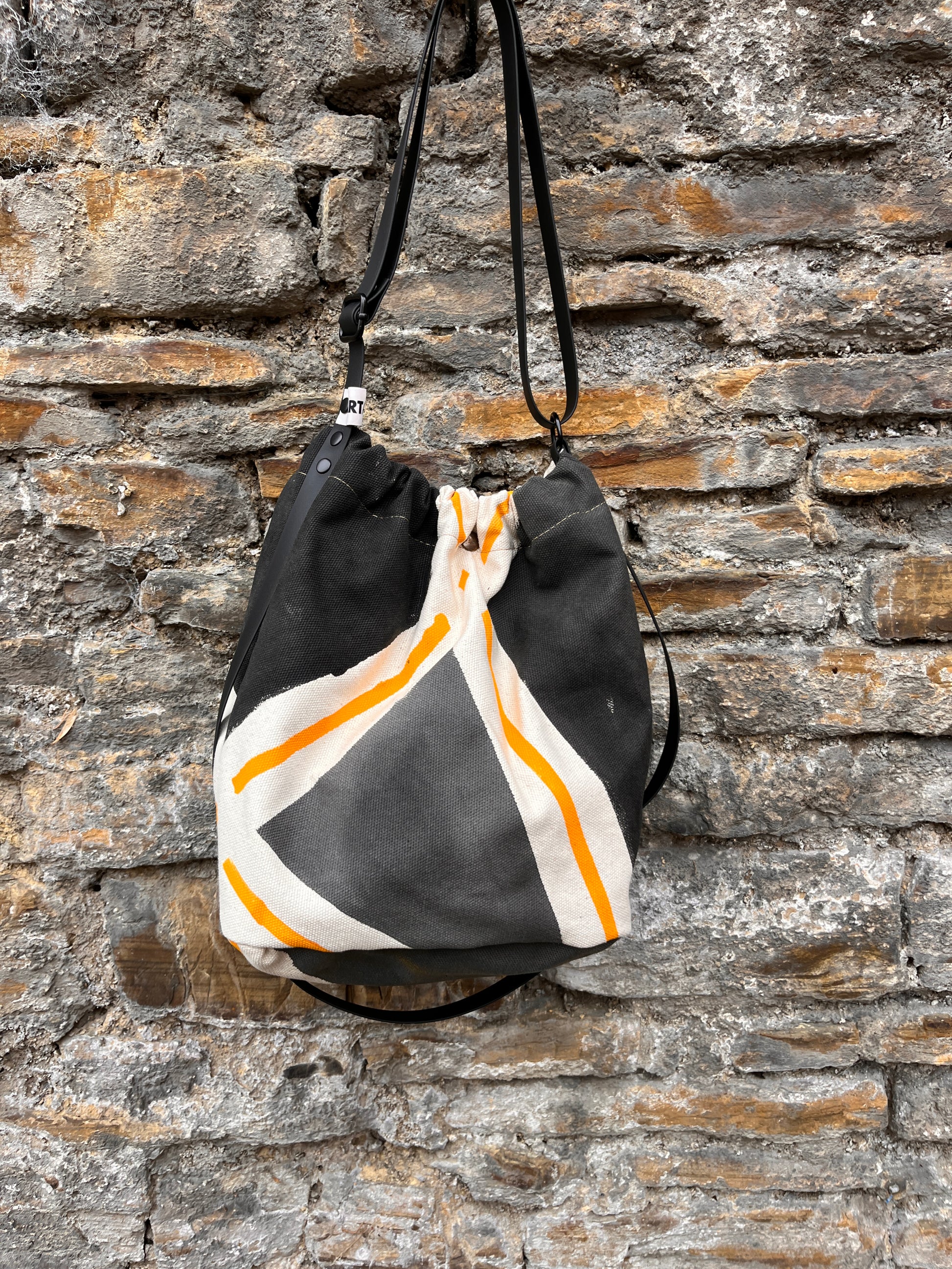 Está pintado a mano sobre algodón orgánico, con un diseño único. Su forma se define gracias a una goma interior que frunce suavemente el tejido, y se cierra con un botón de color oro viejo. La tira larga, que envuelve todo el bolso, es ajustable para que lo lleves como te resulte más cómodo.