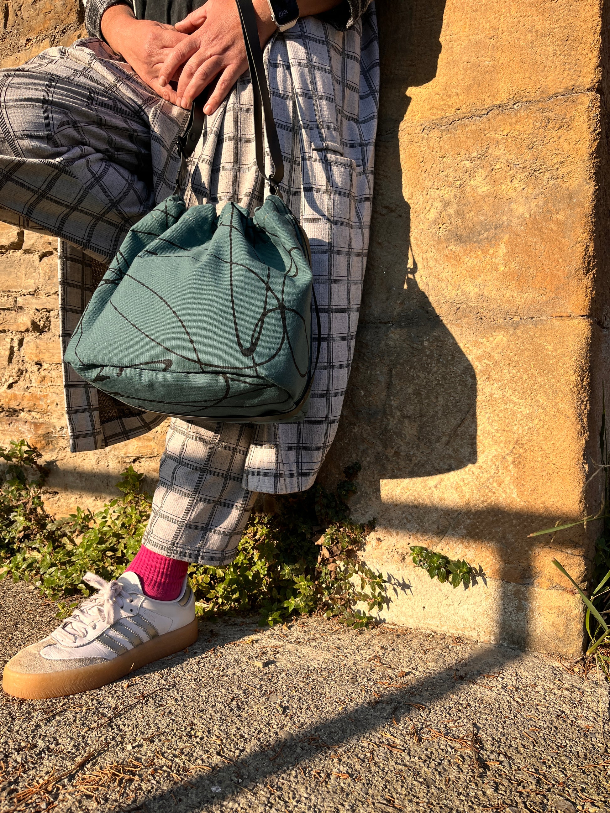 Está pintado a mano sobre algodón orgánico, con un diseño único. Su forma se define gracias a una goma interior que frunce suavemente el tejido, y se cierra con un botón de color oro viejo. La tira larga, que envuelve todo el bolso, es ajustable para que lo lleves como te resulte más cómodo.