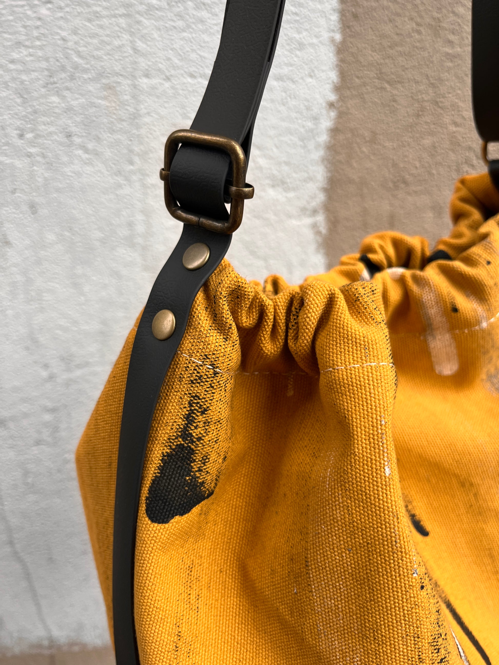 Está pintado a mano sobre algodón orgánico, con un diseño único. Su forma se define gracias a una goma interior que frunce suavemente el tejido, y se cierra con un botón de color oro viejo. La tira larga, que envuelve todo el bolso, es ajustable para que lo lleves como te resulte más cómodo.