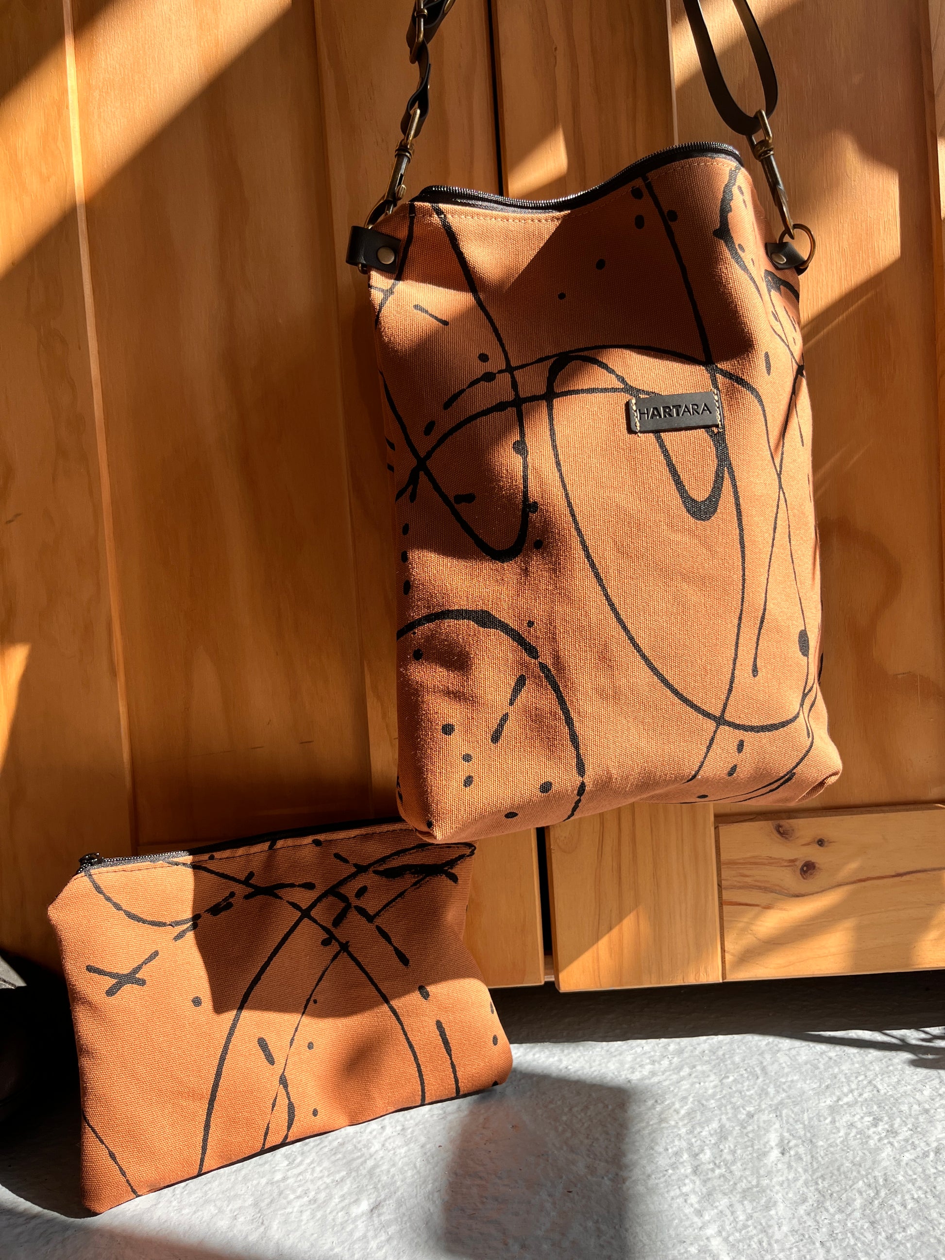 El bolso de tela: está pintado a mano, único, ligero y cómodo. Cada pieza es única y puede variar ligeramente de la imagen que ves. Puedes llevarlo dentro o fuera de la carcasa. En el interior tiene un neceser extraible sujeto con dos imanes.