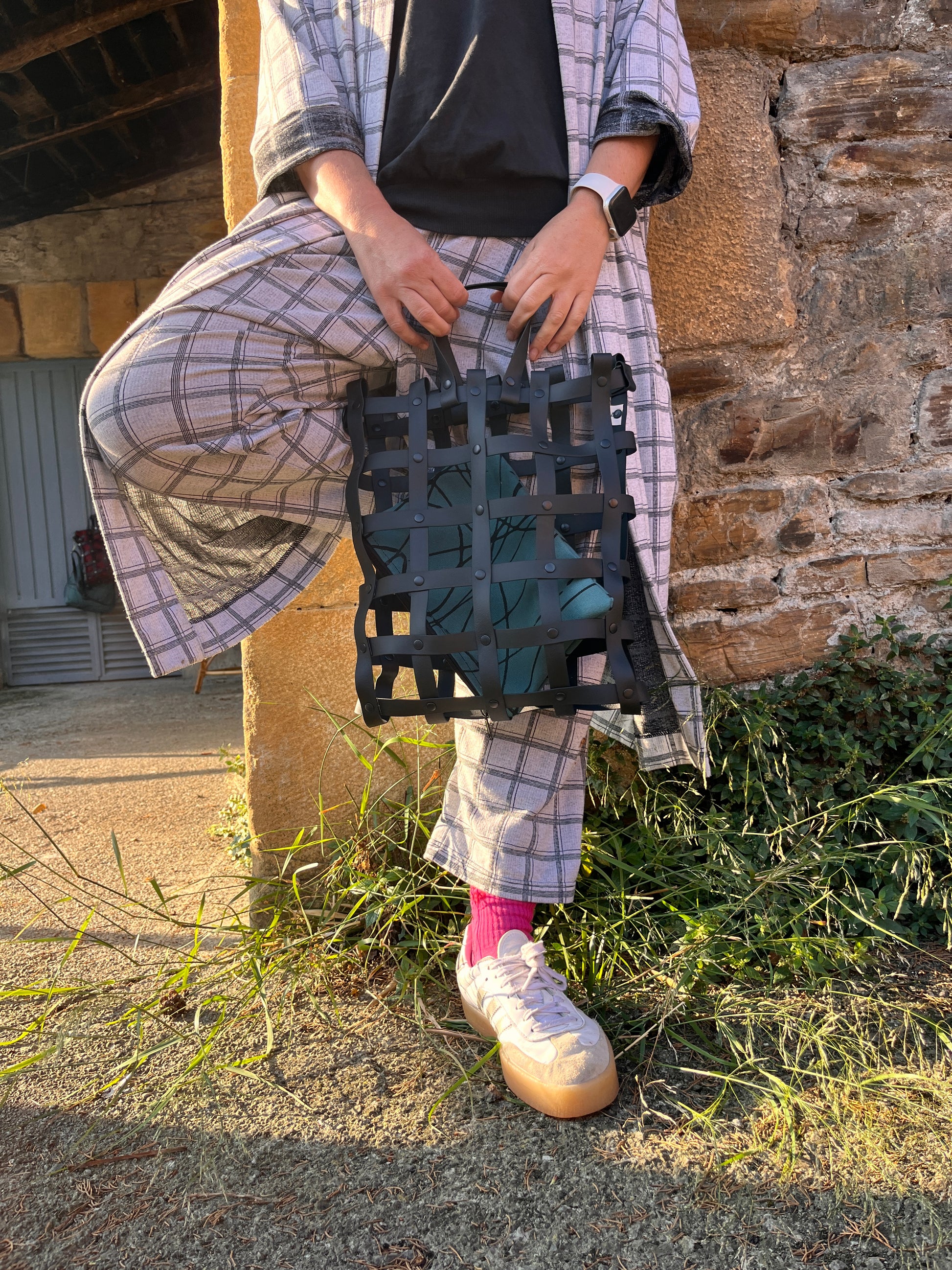 La carcasa: Estructura de tiras entrelazadas de dos cm de ancho, sujetas entre sí con remaches. Carácter y un estilo rompedor.