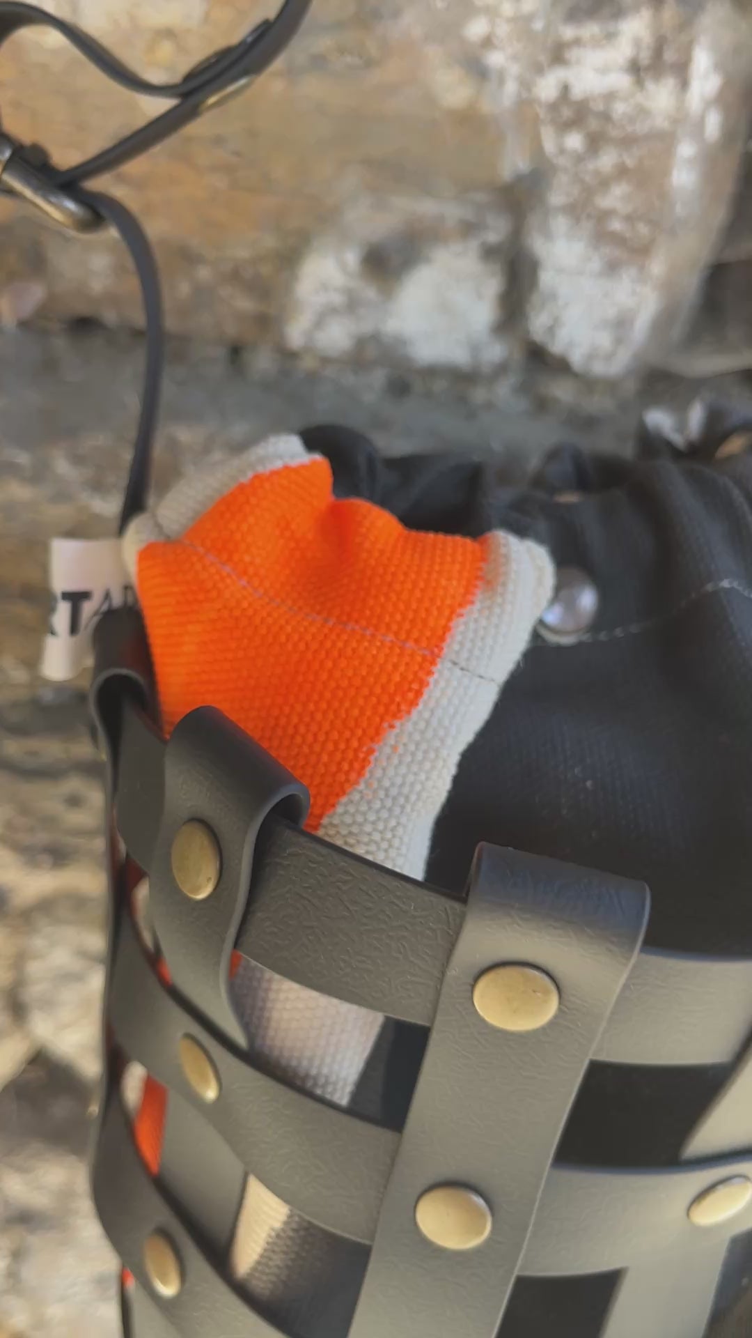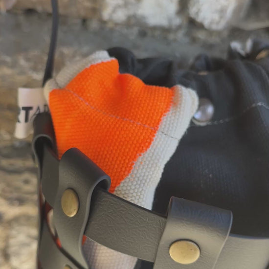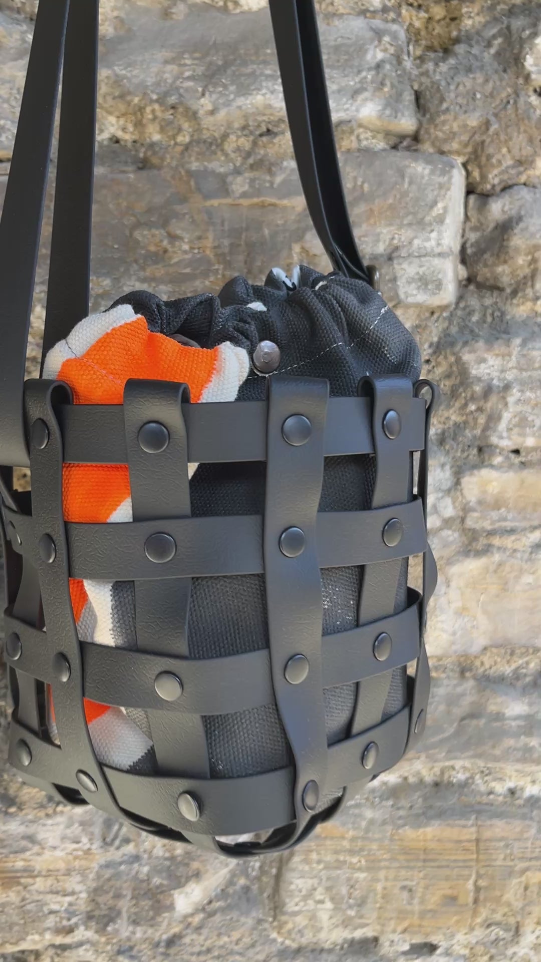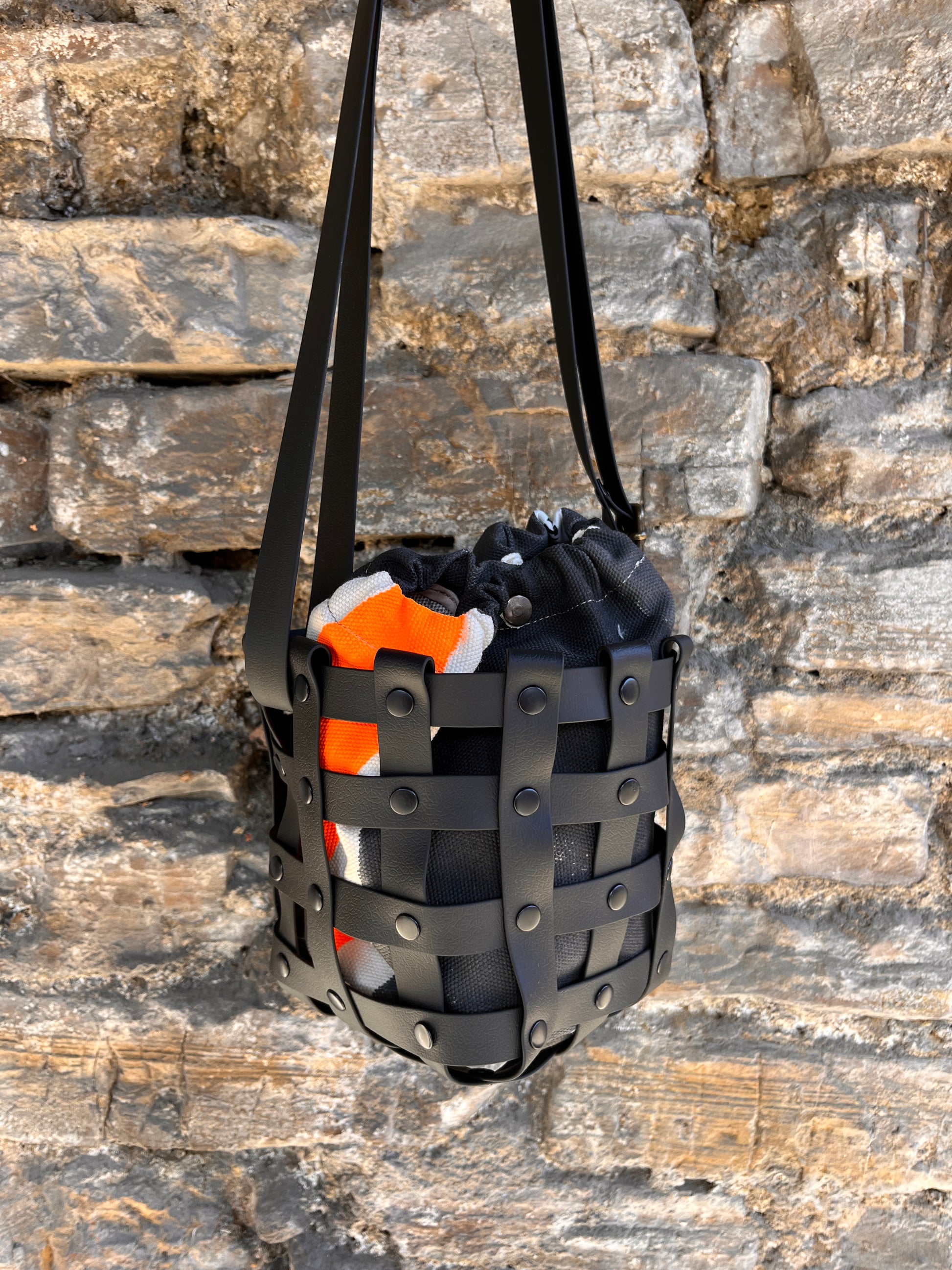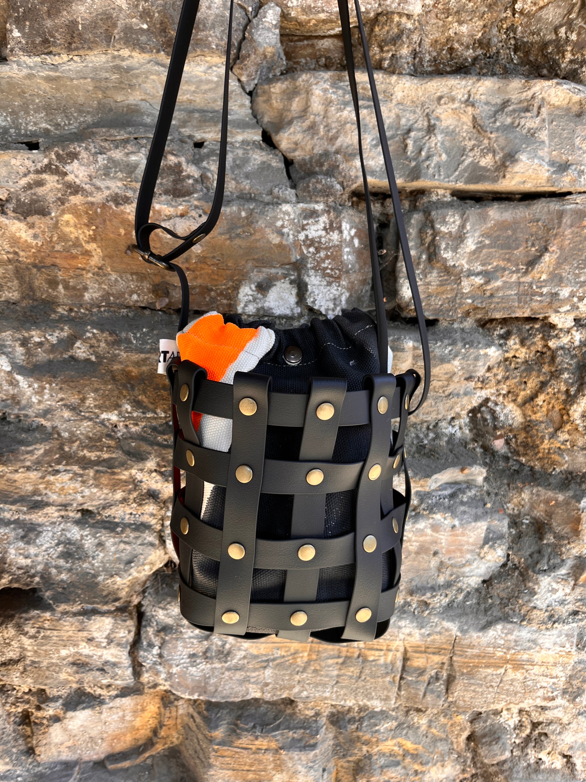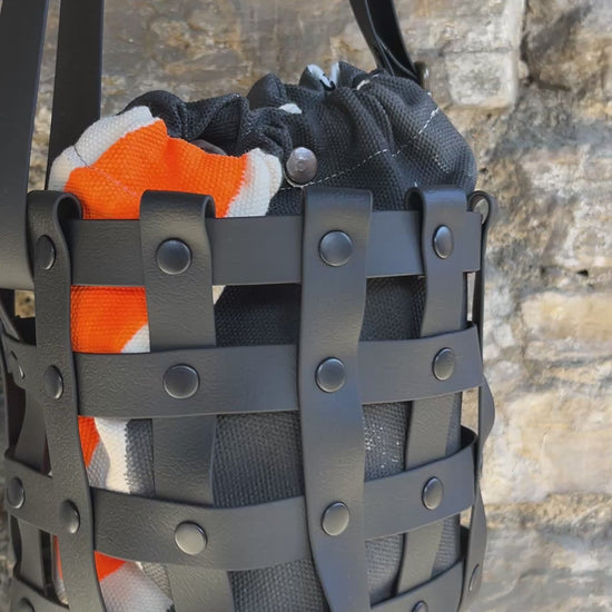 Este bolso no pasa desapercibido. Su estructura está formada por tiras negras e impermeables entrelazadas y rematadas con remaches metálicos en negro. Dentro, un saquito de algodón orgánico pintado a mano aporta el alma: cada trazo es único, cada bolso es irrepetible.