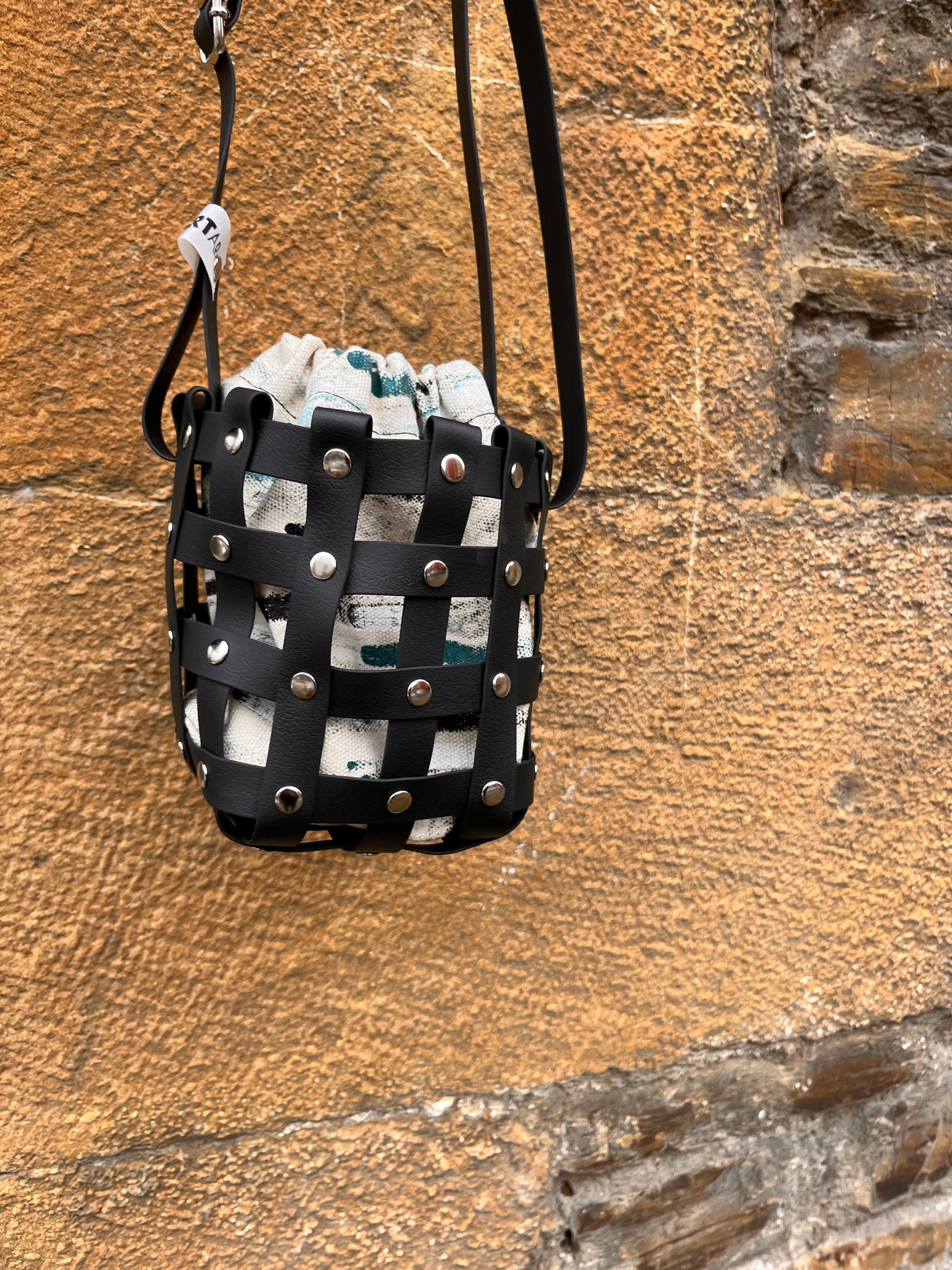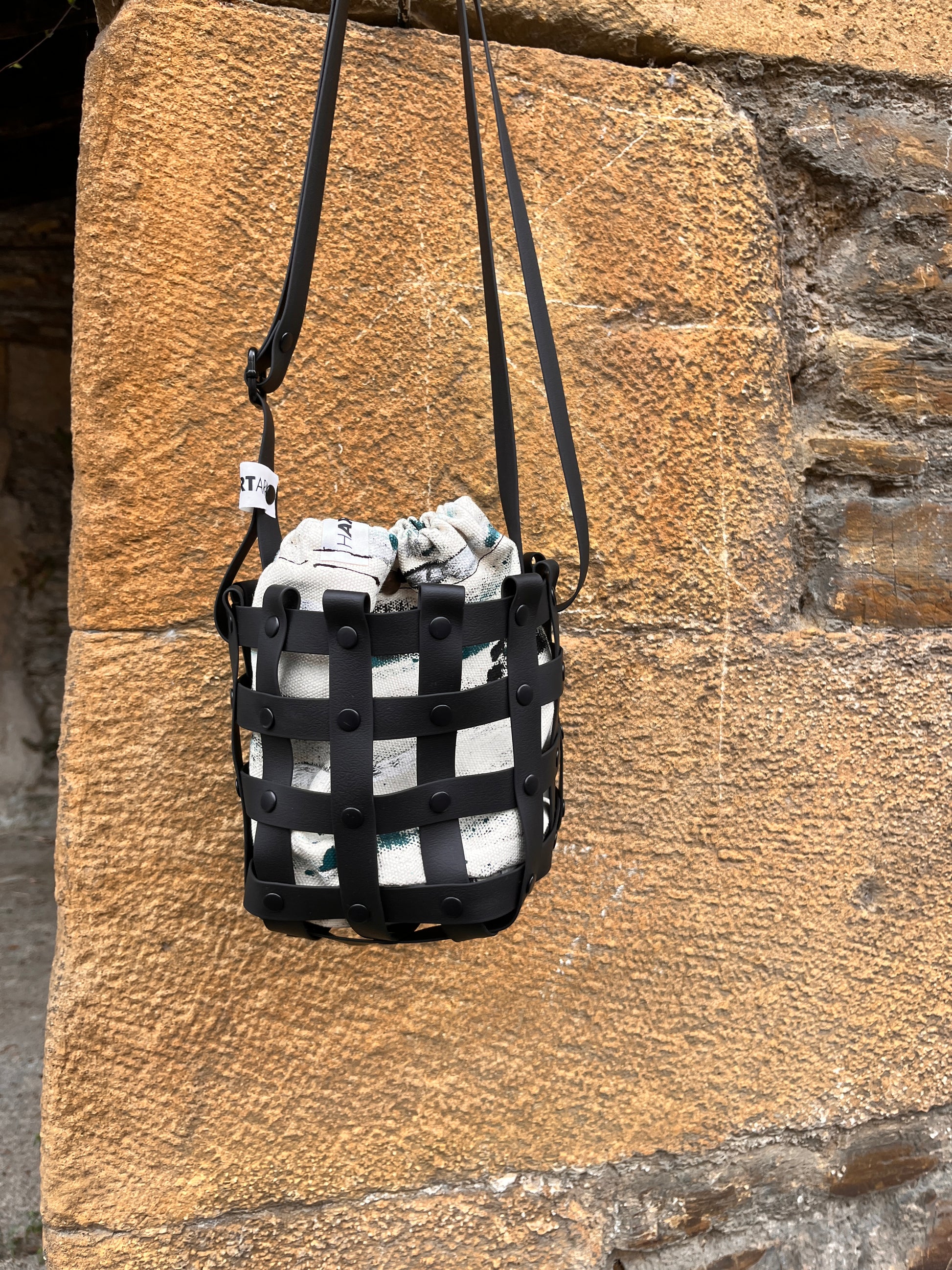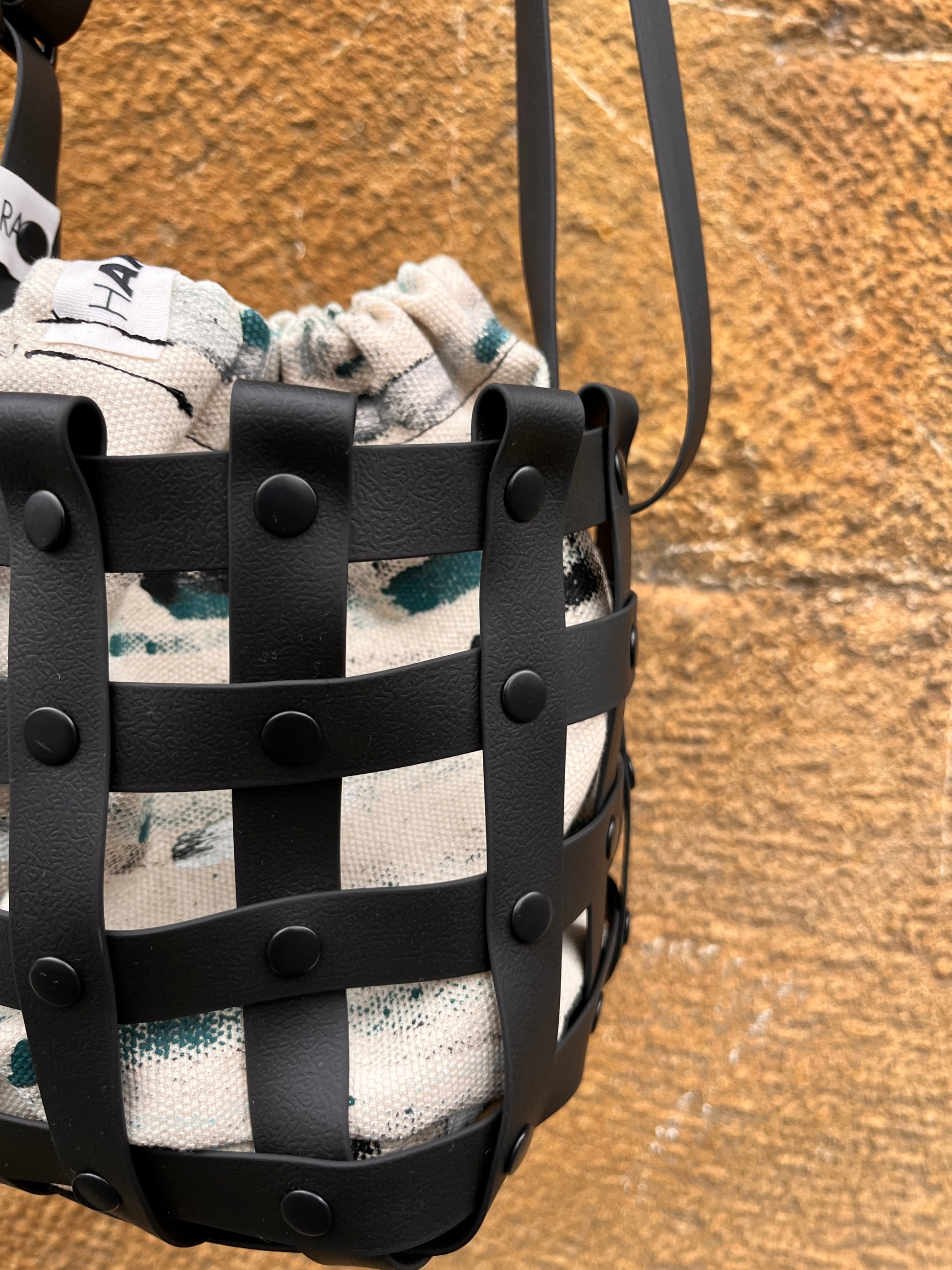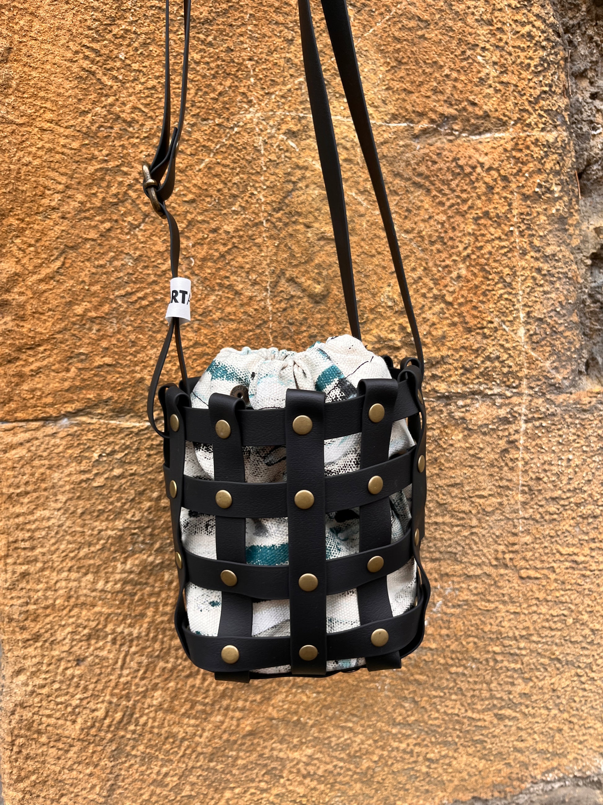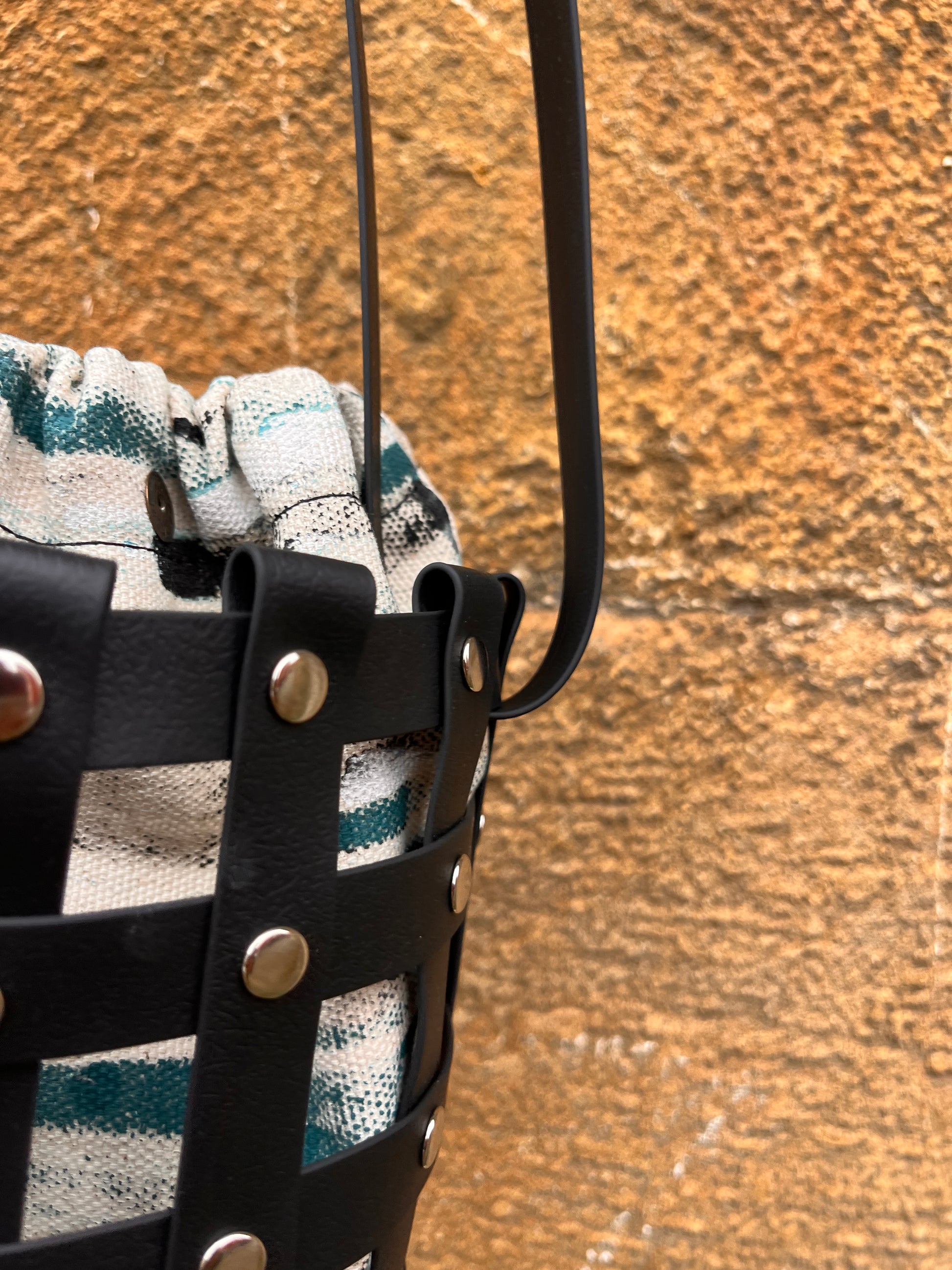 Este bolso no pasa desapercibido. Su estructura está formada por tiras negras e impermeables entrelazadas y rematadas con remaches metálicos en negro. Dentro, un saquito de algodón orgánico pintado a mano aporta el alma: cada trazo es único, cada bolso es irrepetible.
