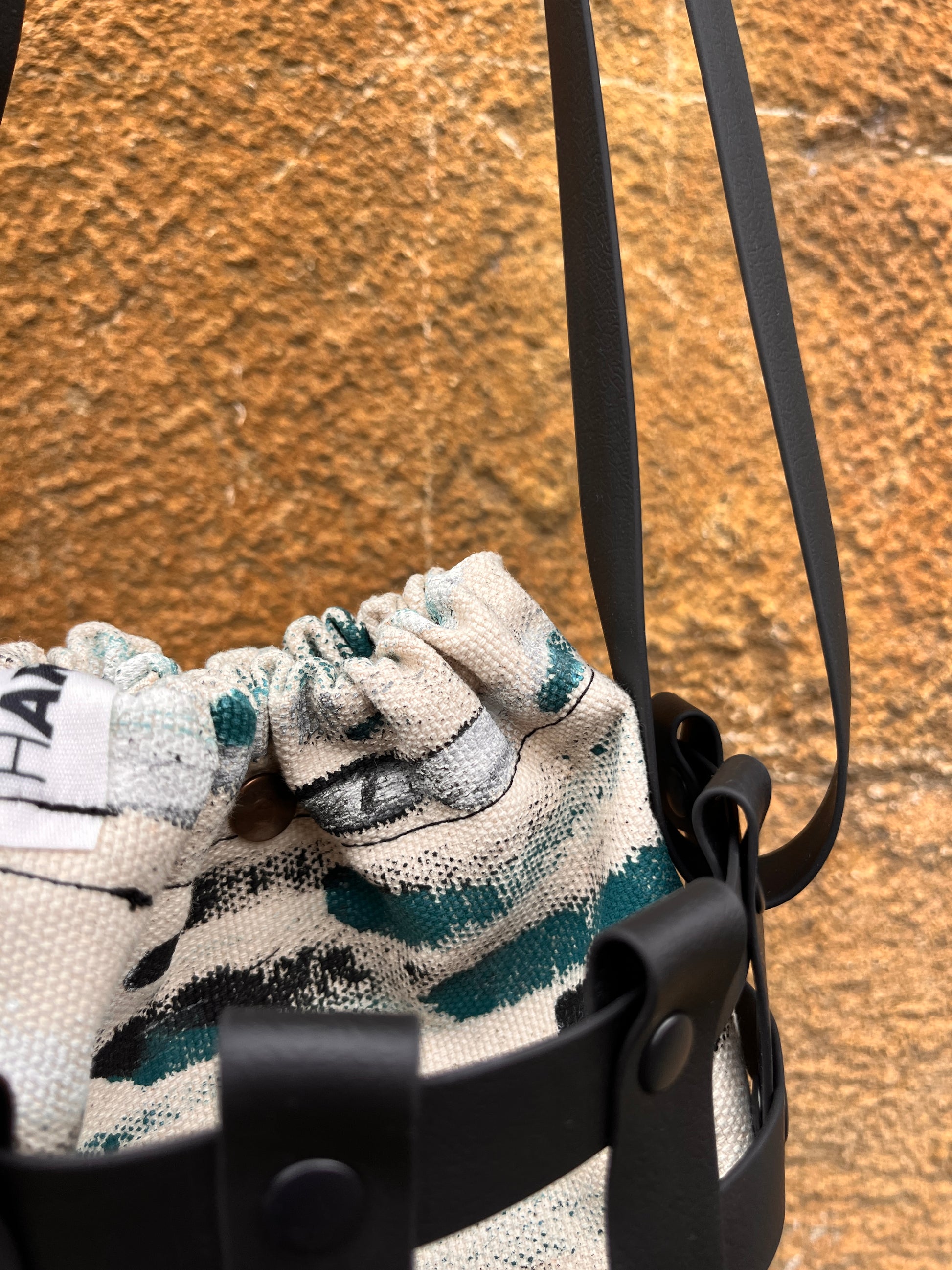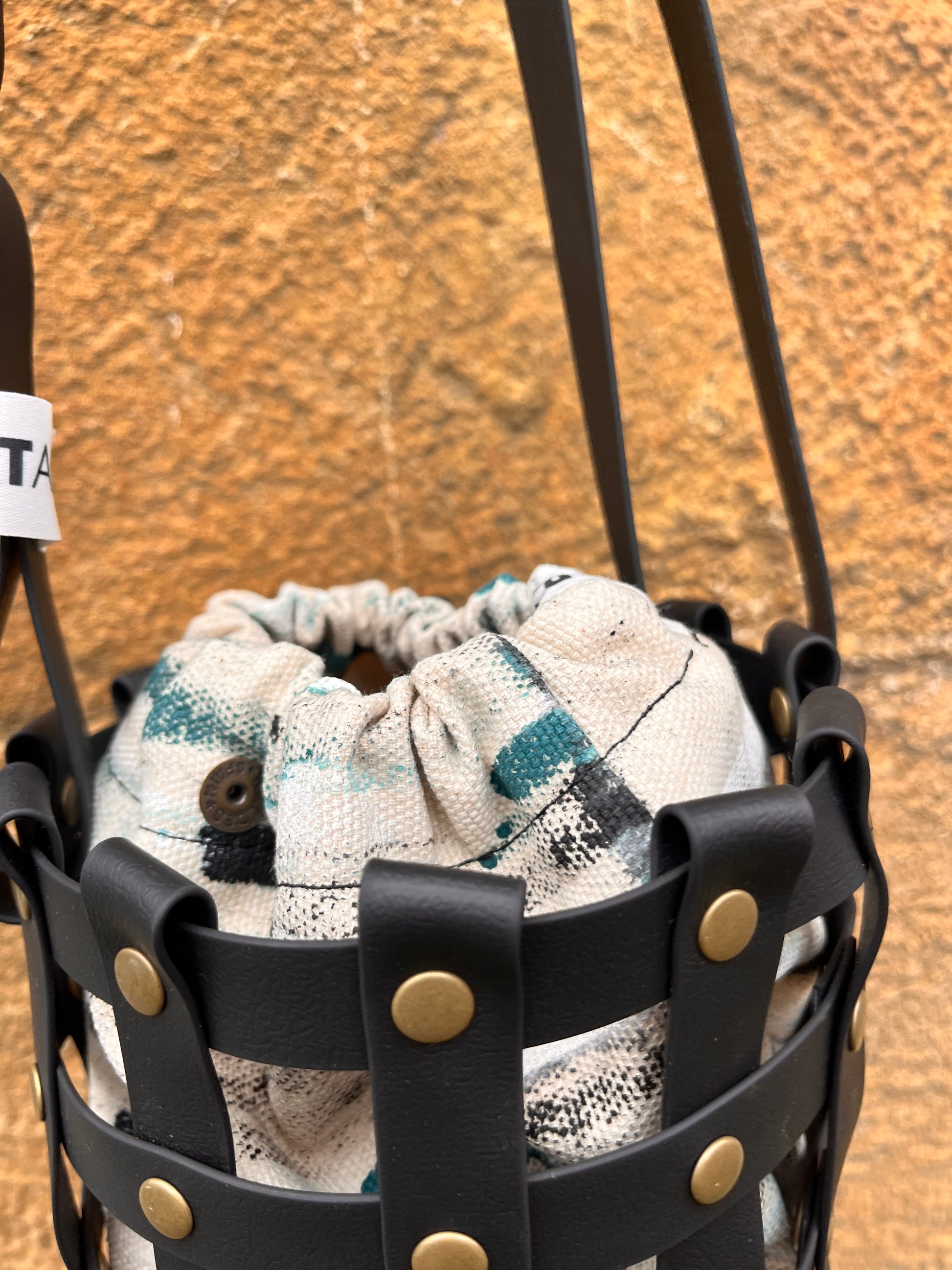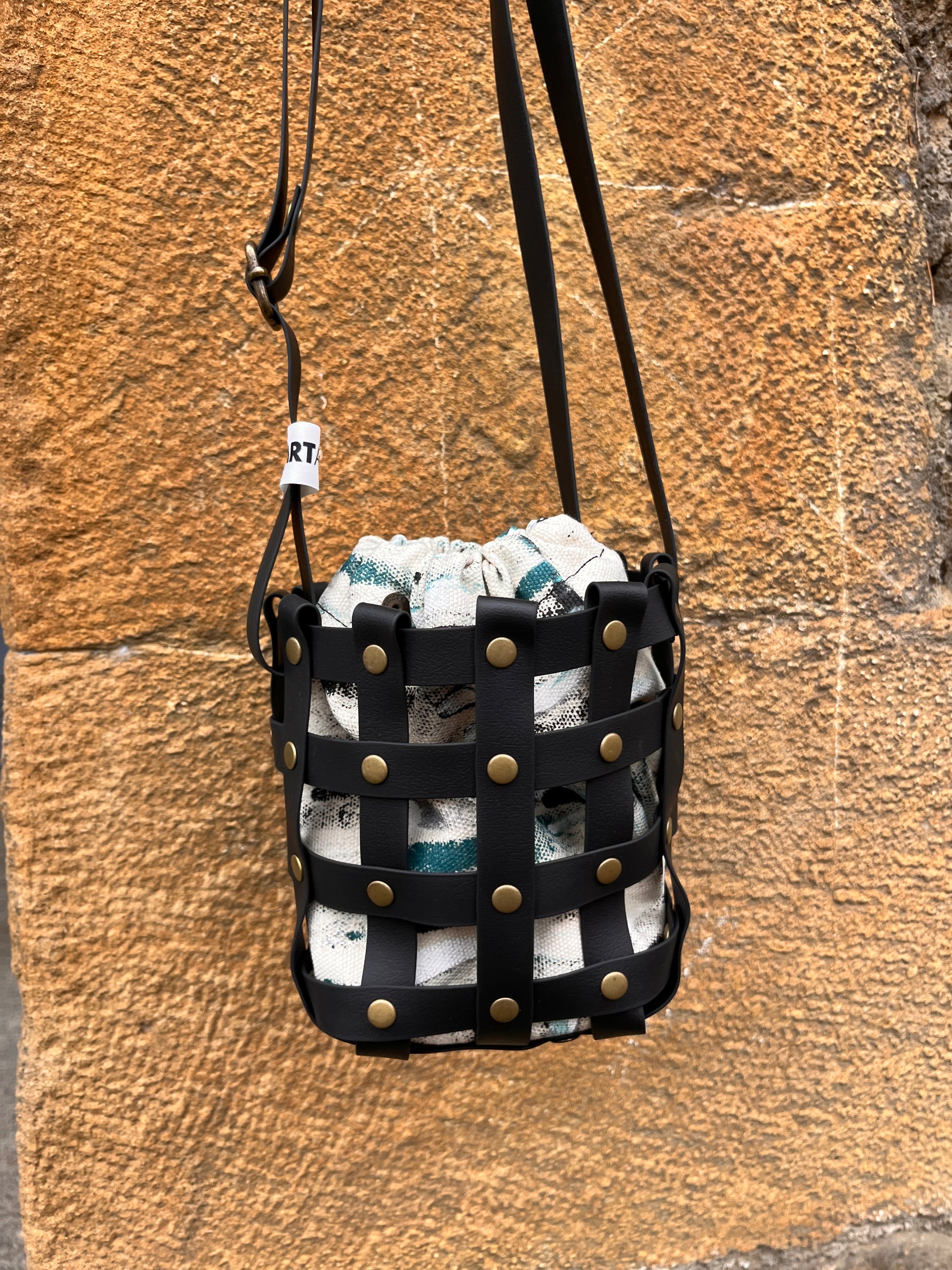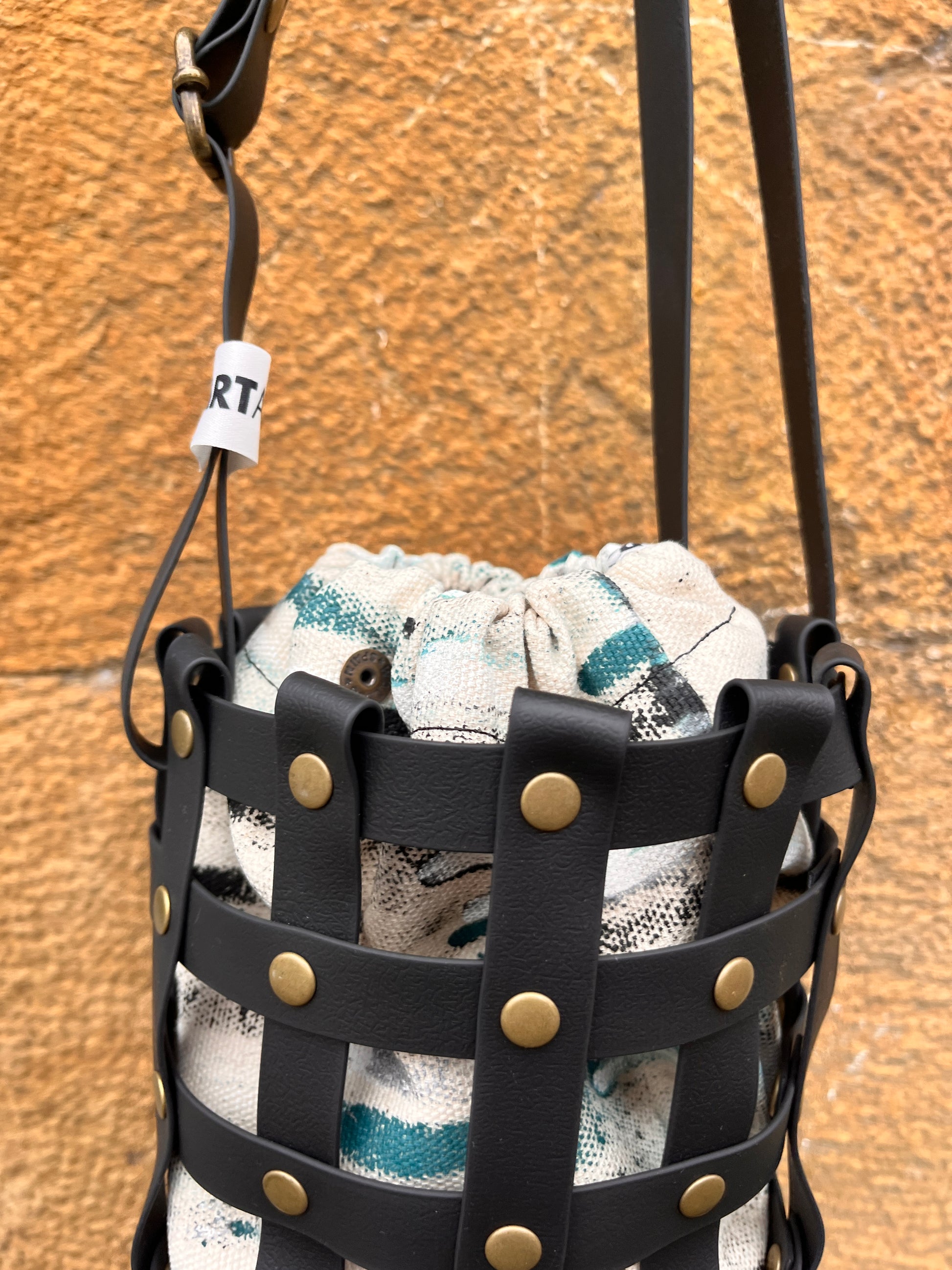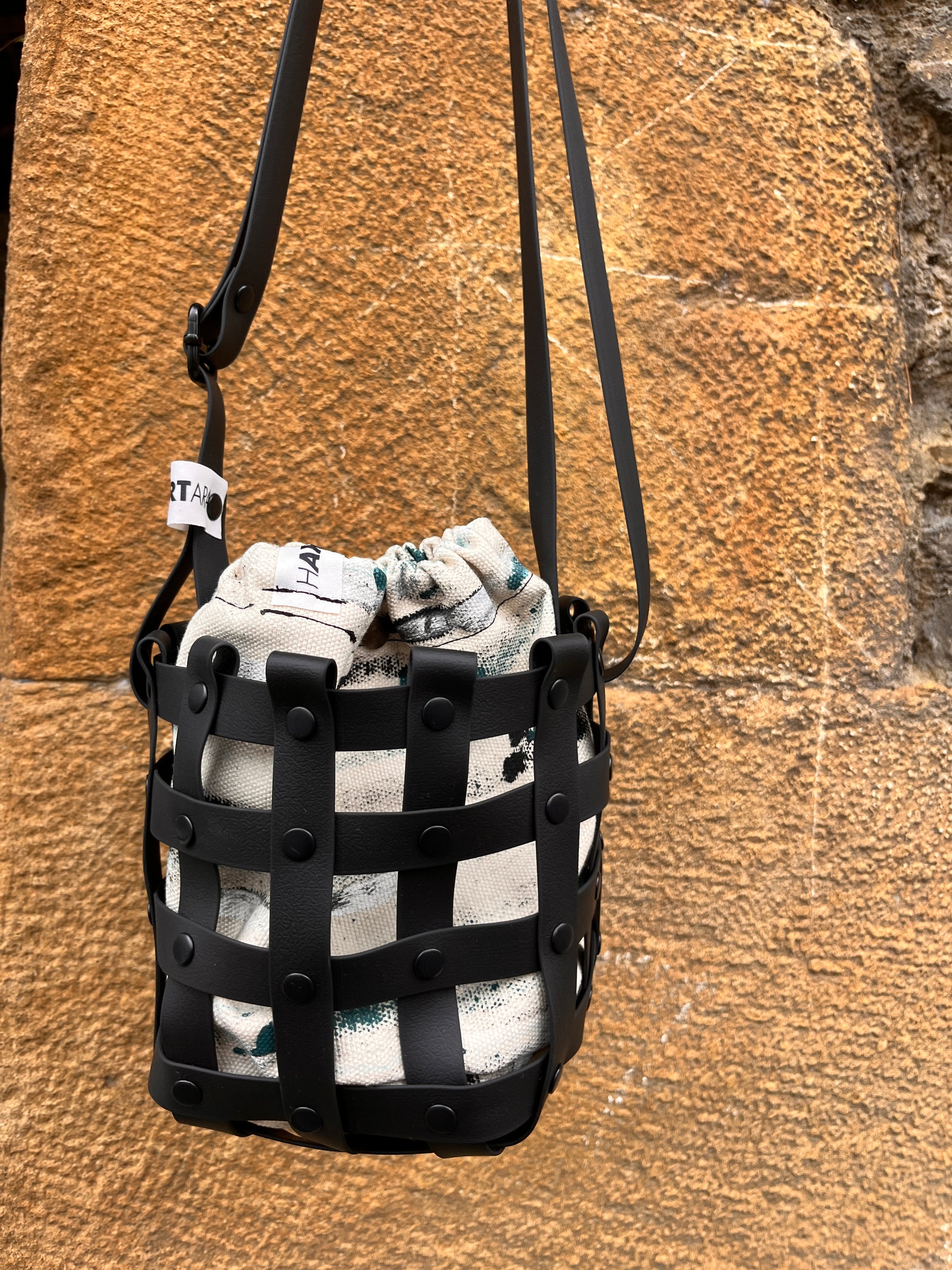Este bolso no pasa desapercibido. Su estructura está formada por tiras negras e impermeables entrelazadas y rematadas con remaches metálicos en negro. Dentro, un saquito de algodón orgánico pintado a mano aporta el alma: cada trazo es único, cada bolso es irrepetible.