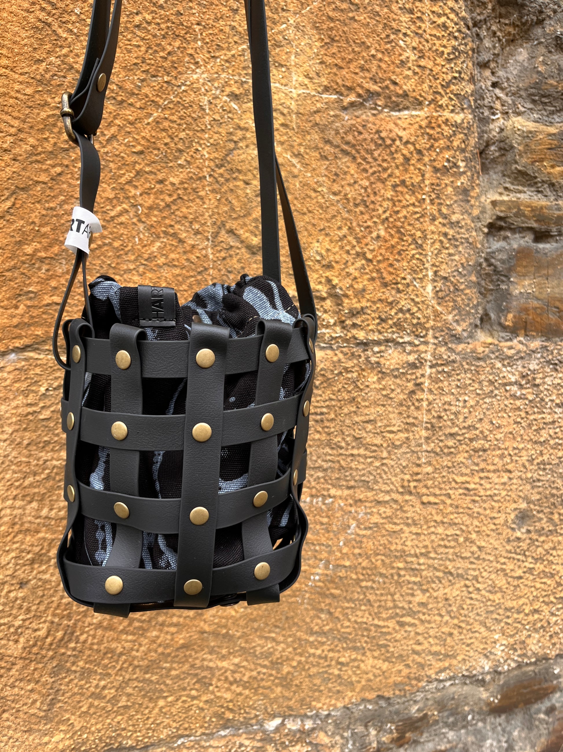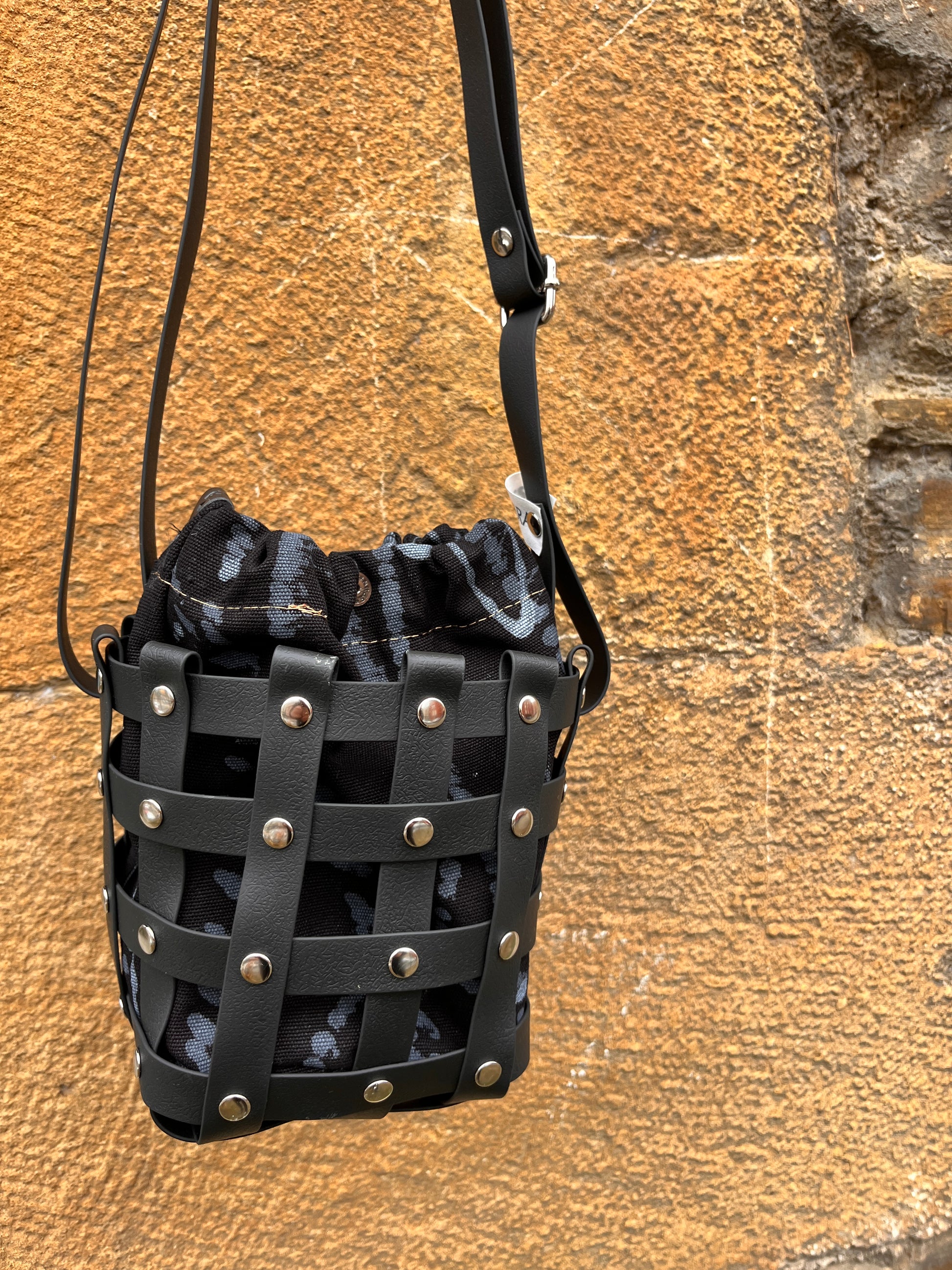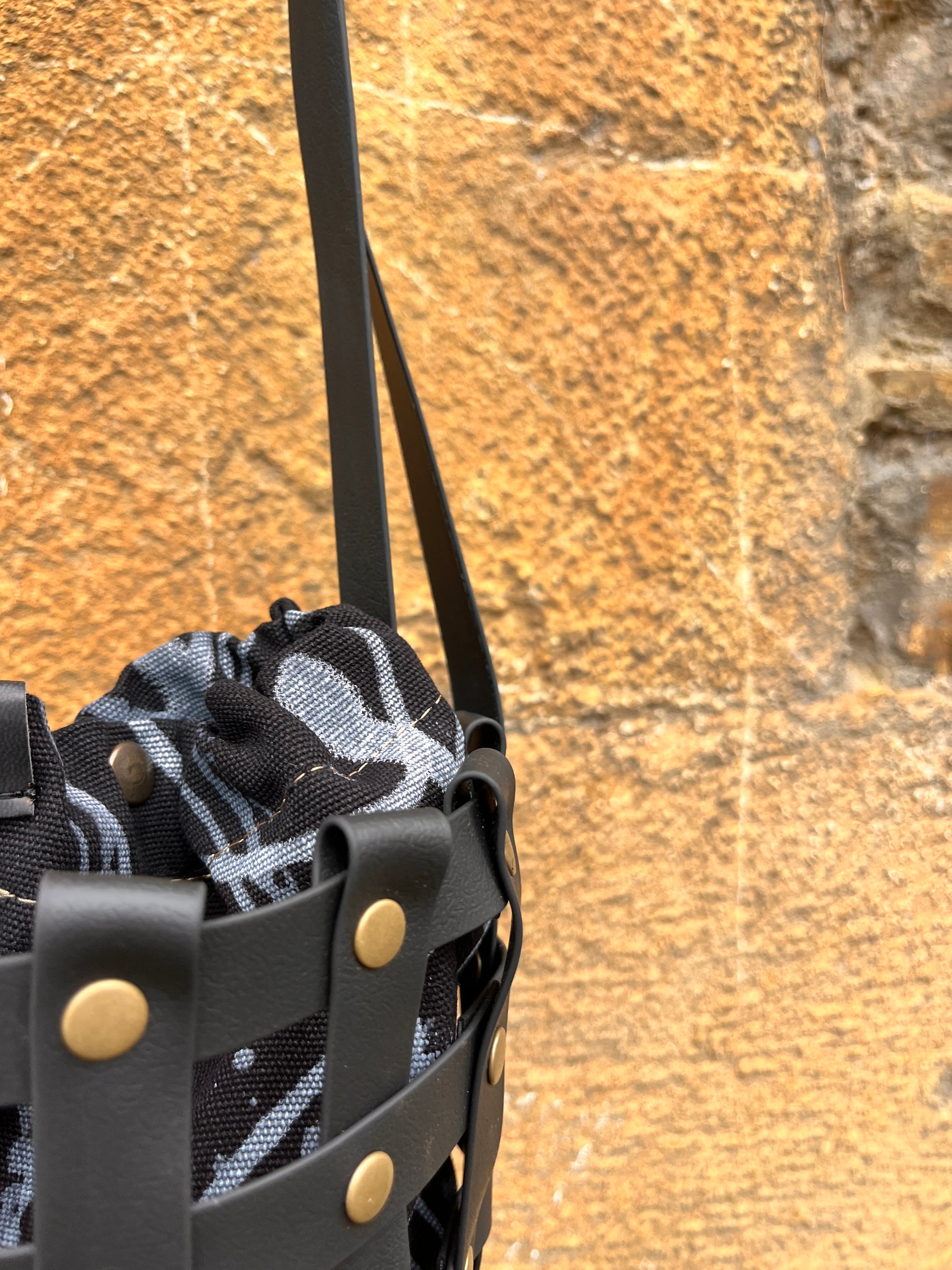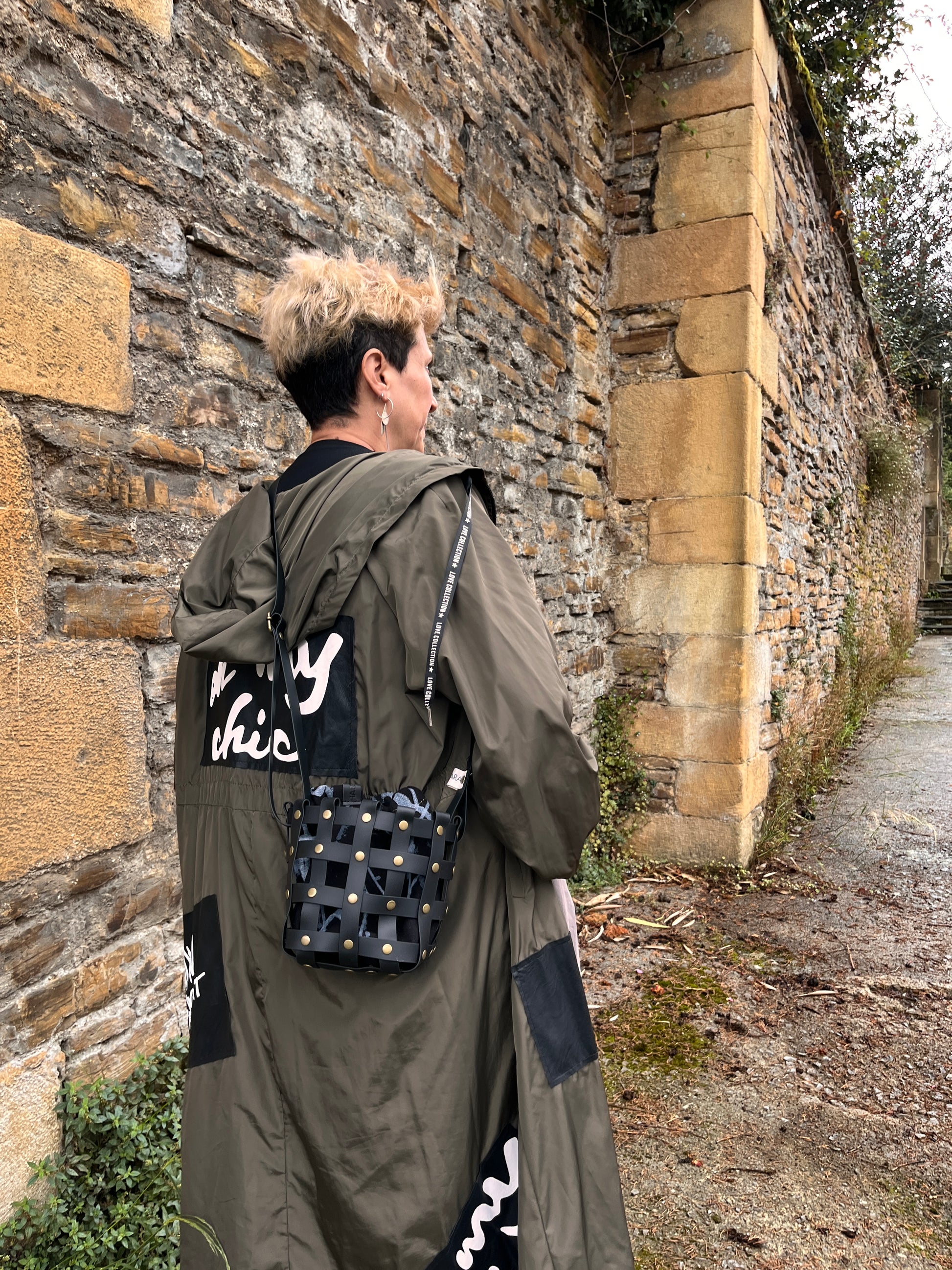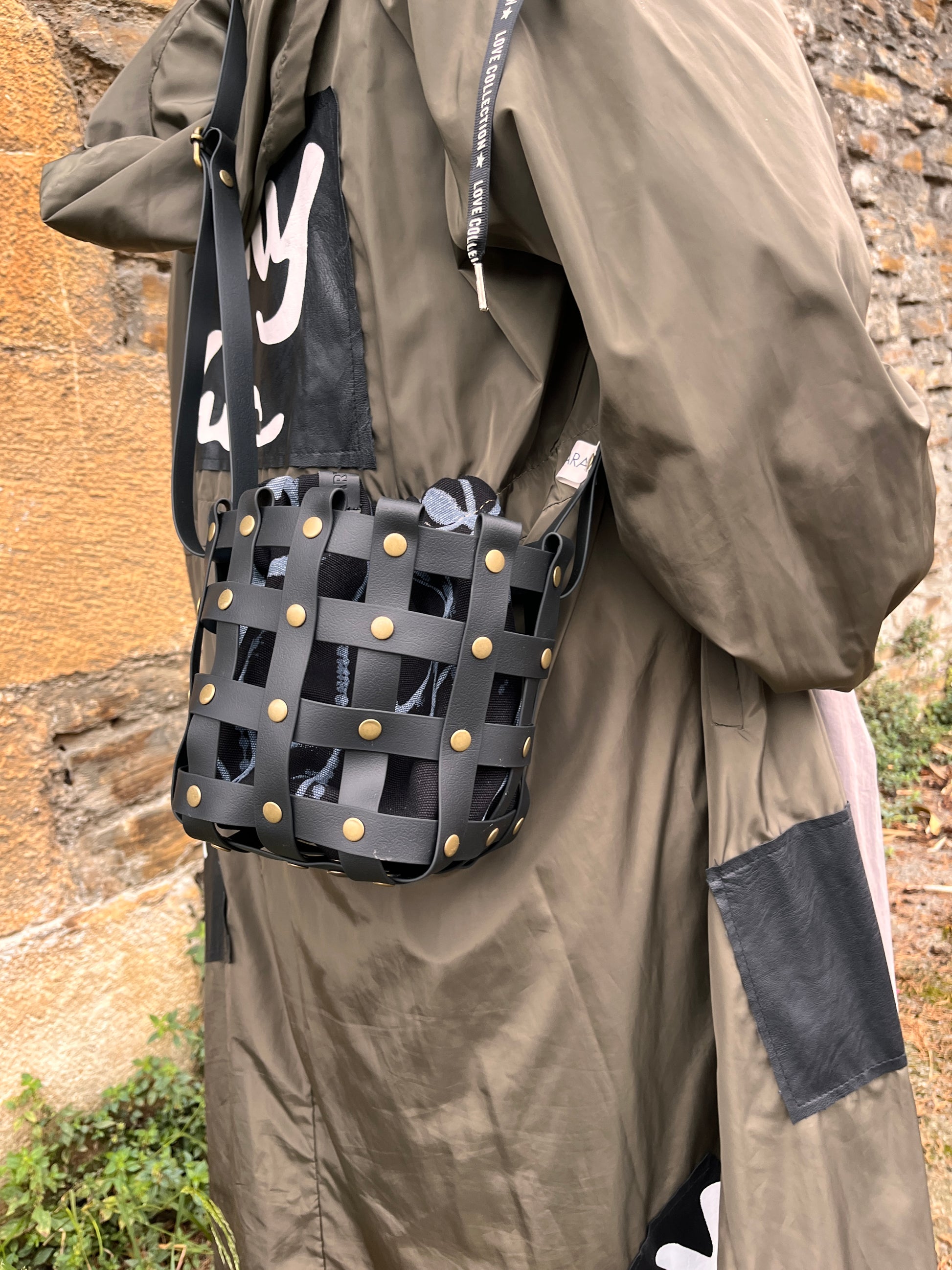 Este bolso no pasa desapercibido. Su estructura está formada por tiras negras e impermeables entrelazadas y rematadas con remaches metálicos en negro. Dentro, un saquito de algodón orgánico pintado a mano aporta el alma: cada trazo es único, cada bolso es irrepetible.
