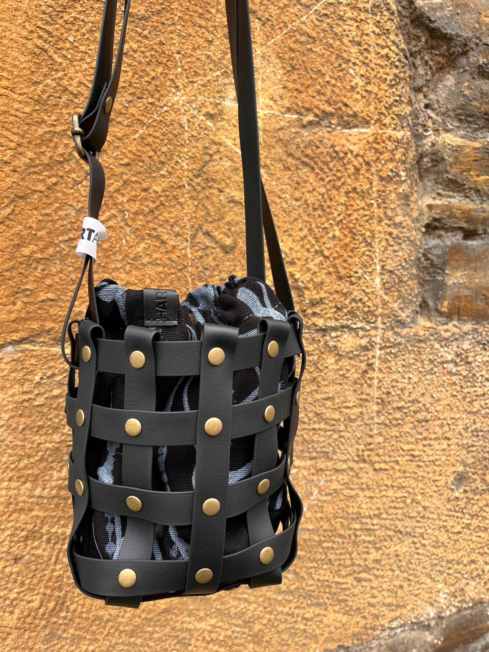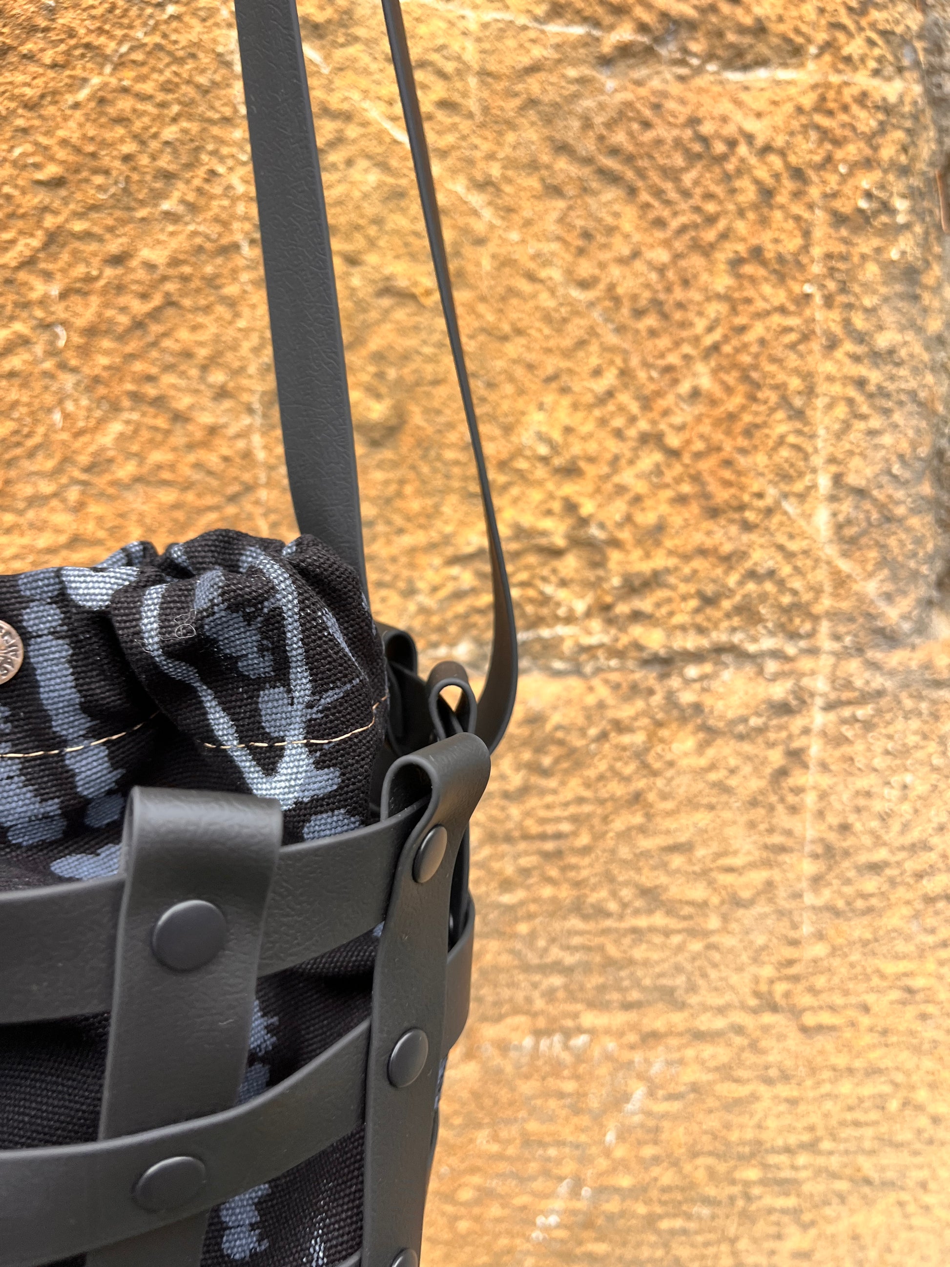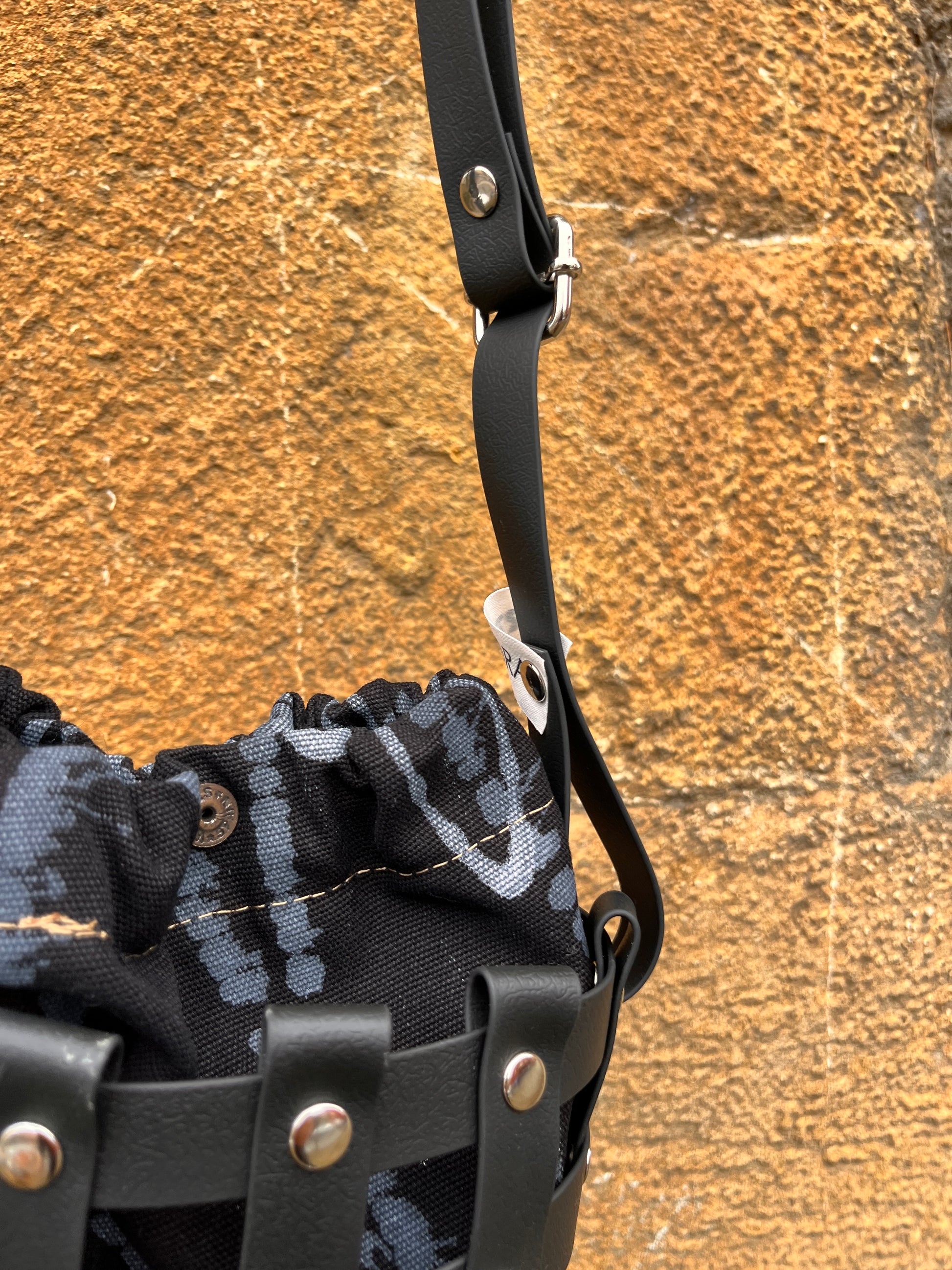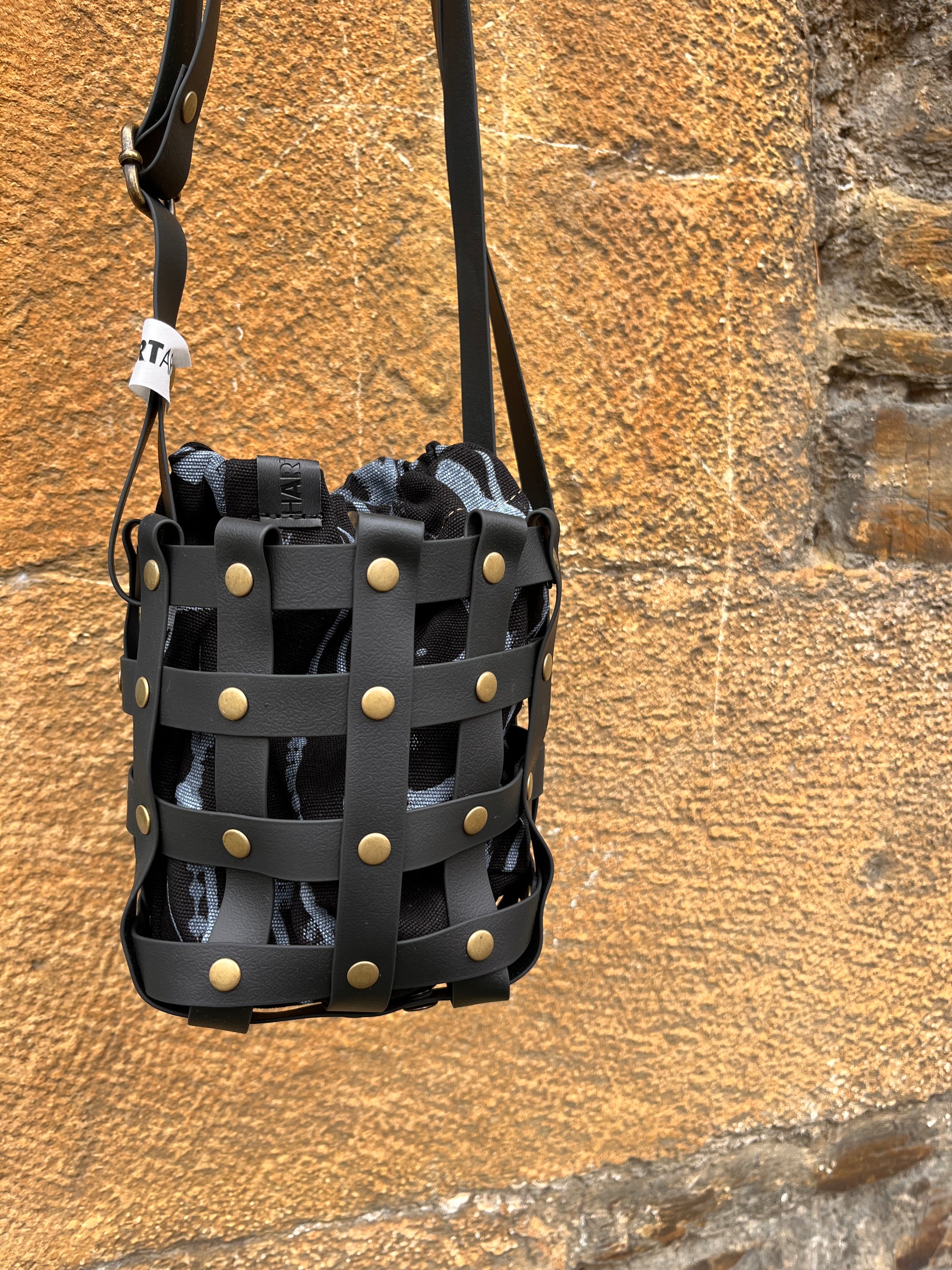 Este bolso no pasa desapercibido. Su estructura está formada por tiras negras e impermeables entrelazadas y rematadas con remaches metálicos en negro. Dentro, un saquito de algodón orgánico pintado a mano aporta el alma: cada trazo es único, cada bolso es irrepetible.