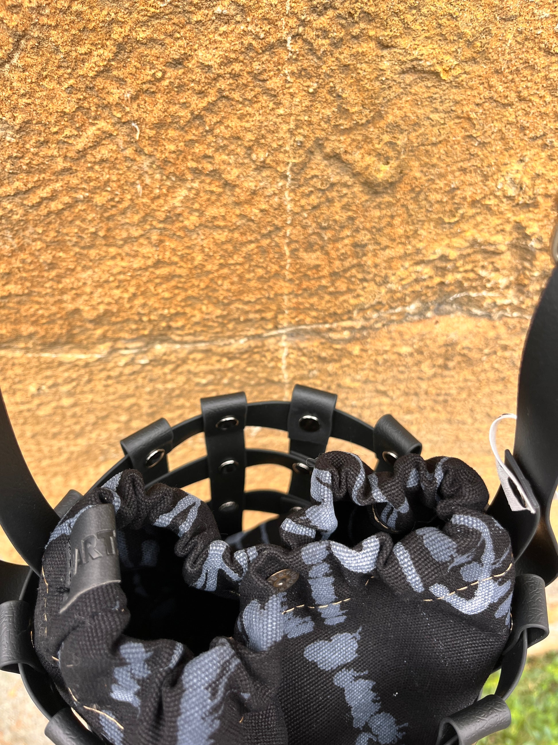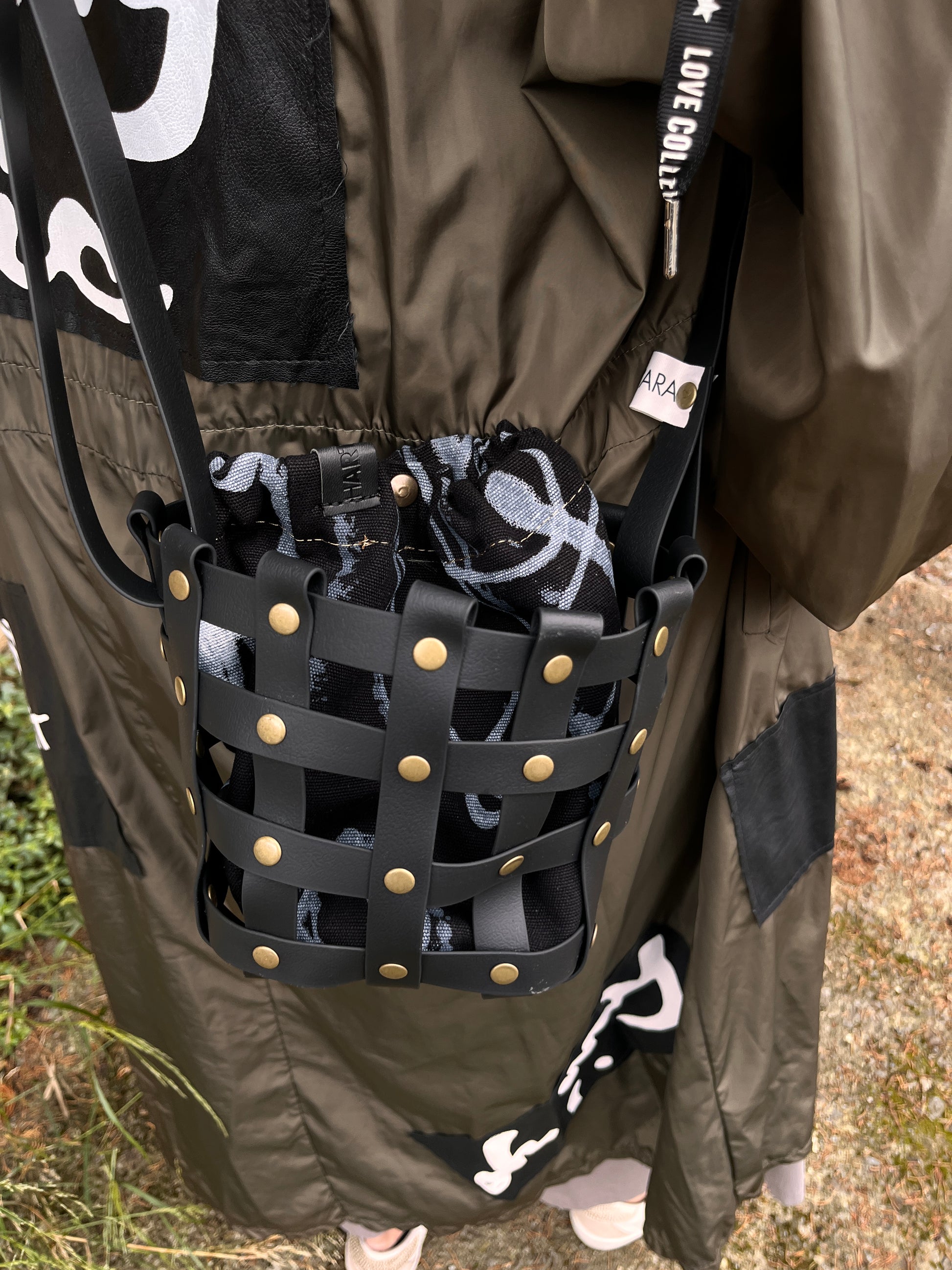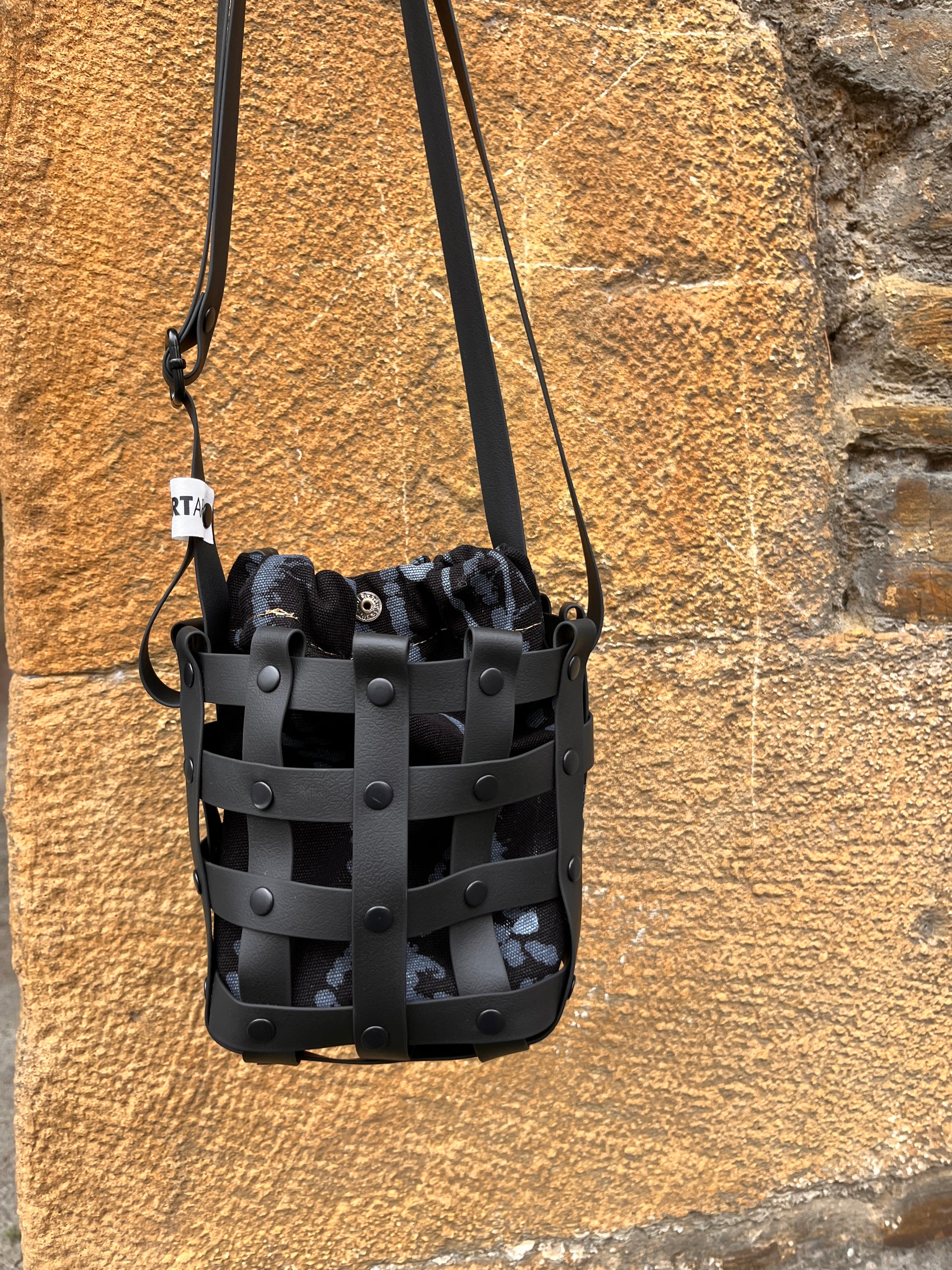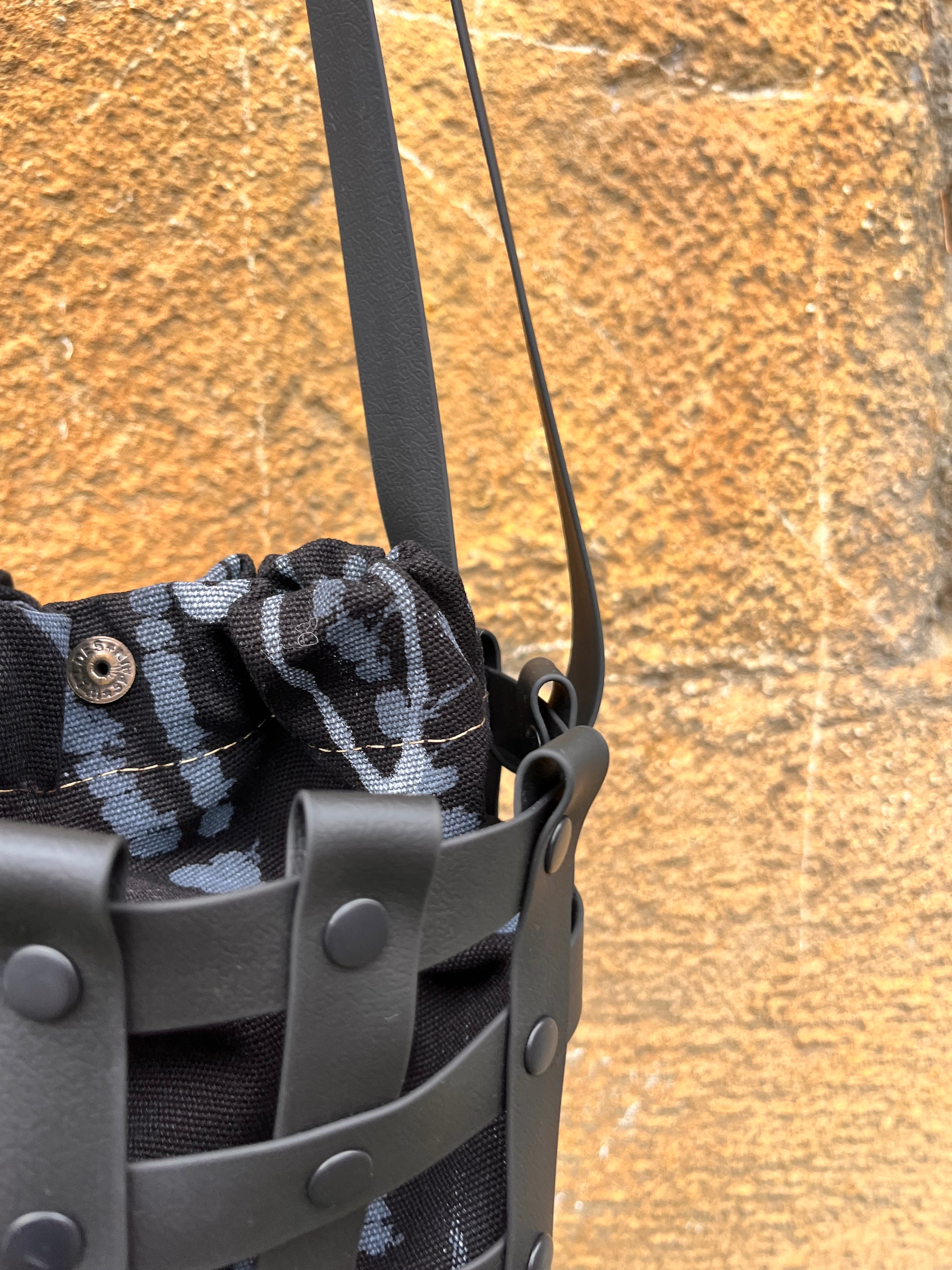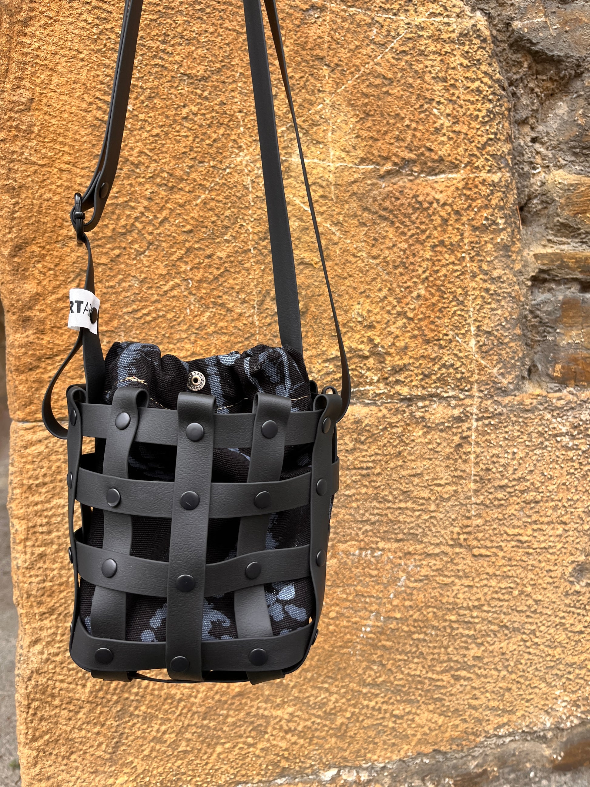 Este bolso no pasa desapercibido. Su estructura está formada por tiras negras e impermeables entrelazadas y rematadas con remaches metálicos en negro. Dentro, un saquito de algodón orgánico pintado a mano aporta el alma: cada trazo es único, cada bolso es irrepetible.