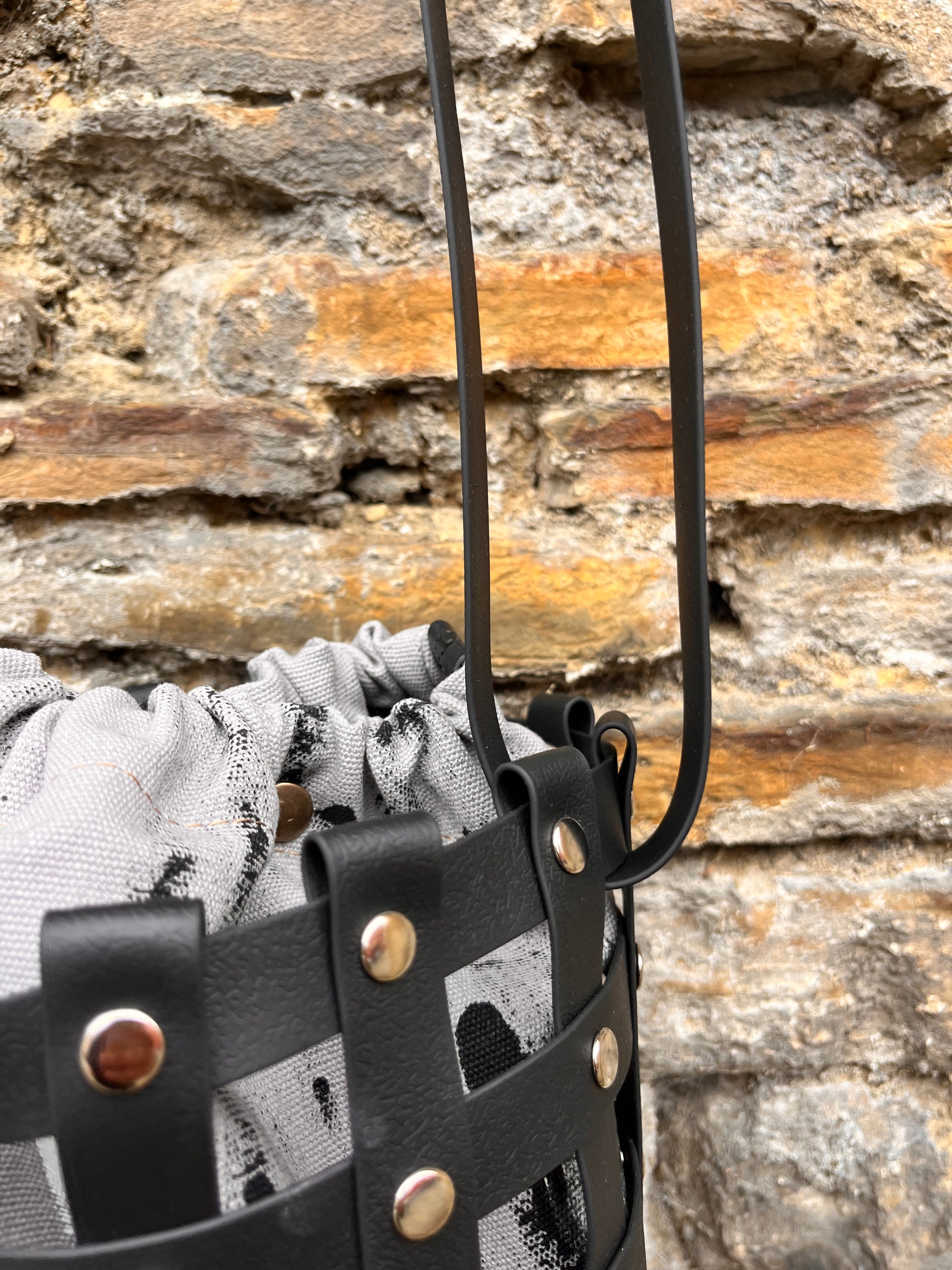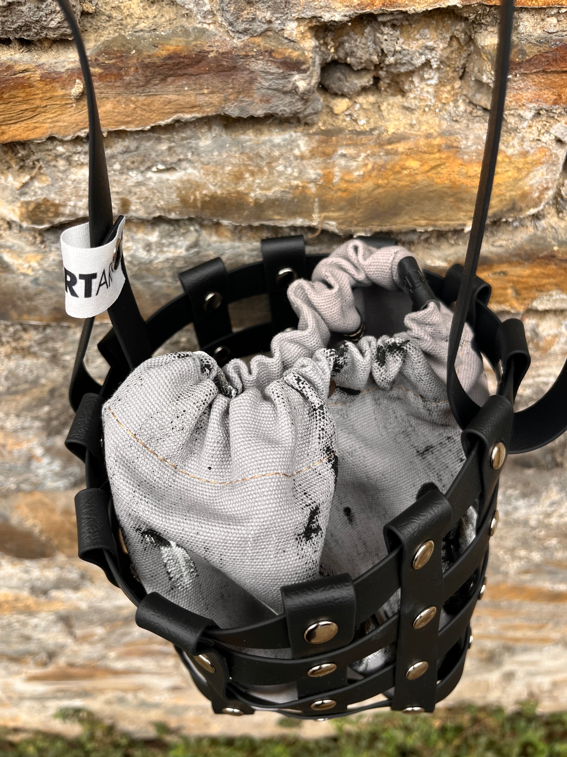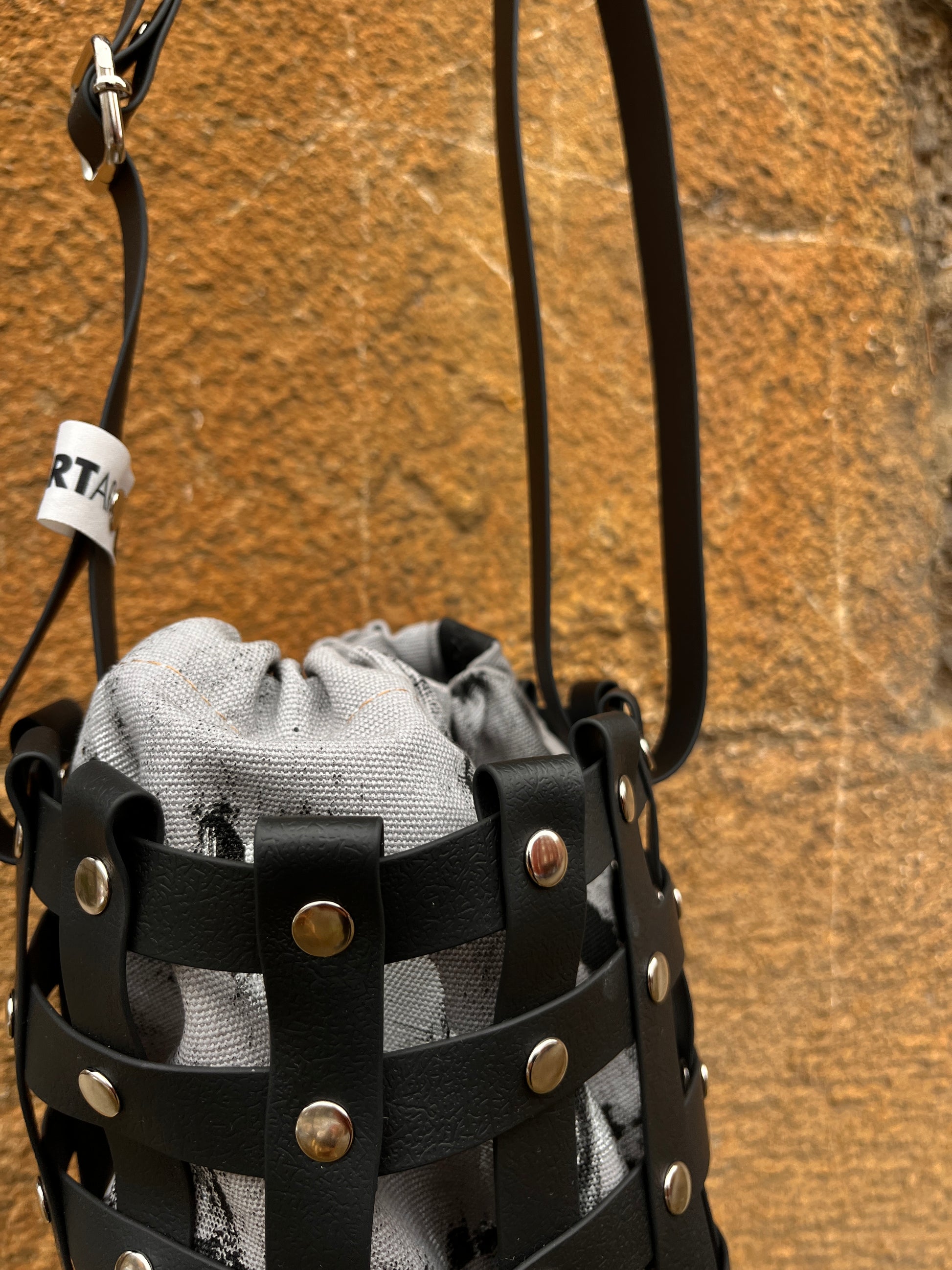 Este bolso no pasa desapercibido. Su estructura está formada por tiras negras e impermeables entrelazadas y rematadas con remaches metálicos en negro. Dentro, un saquito de algodón orgánico pintado a mano aporta el alma: cada trazo es único, cada bolso es irrepetible.