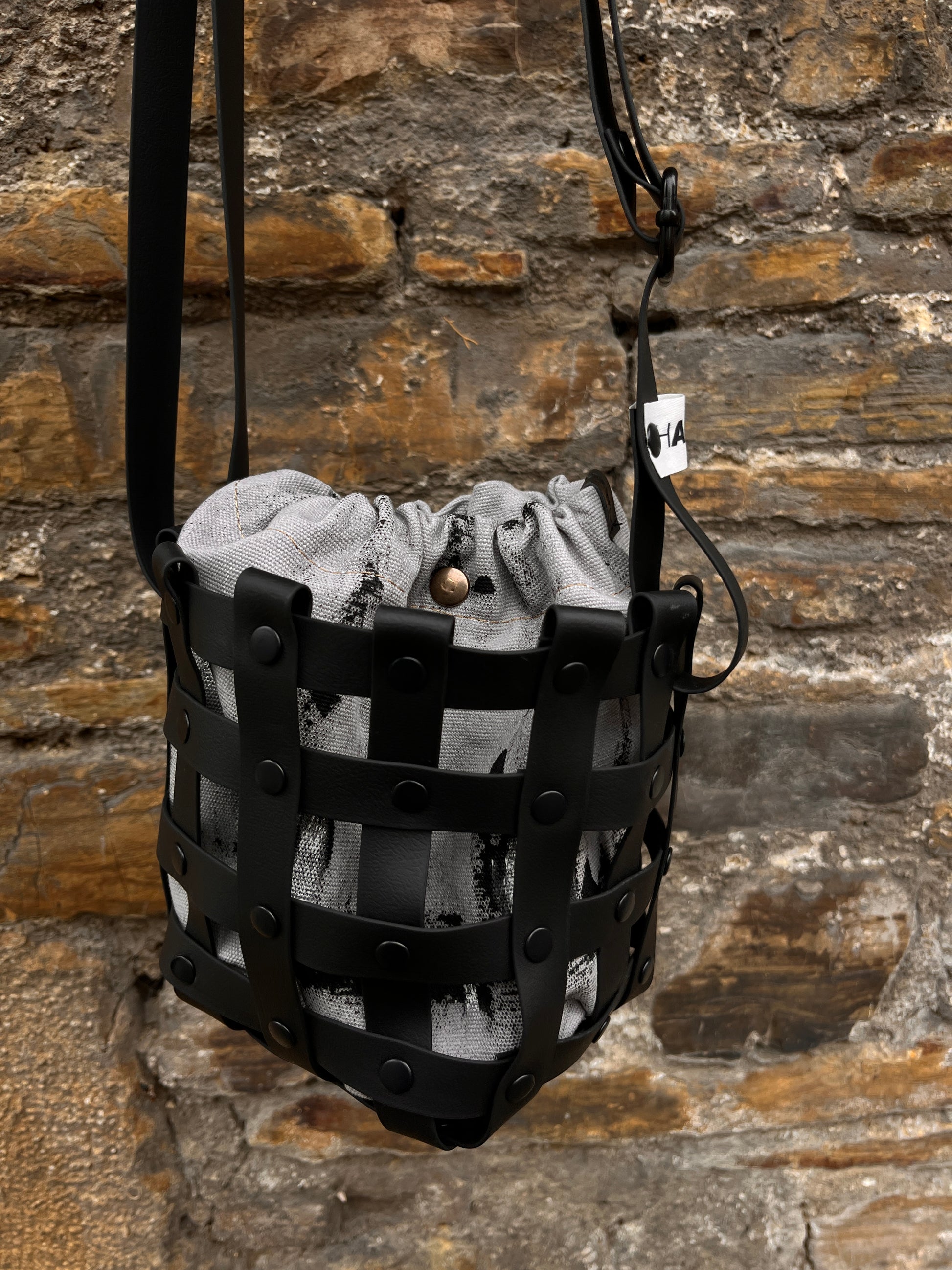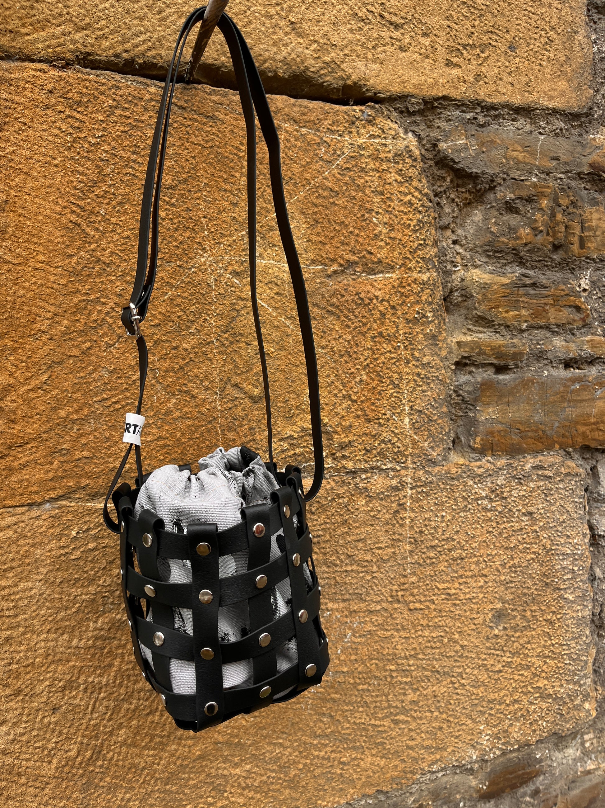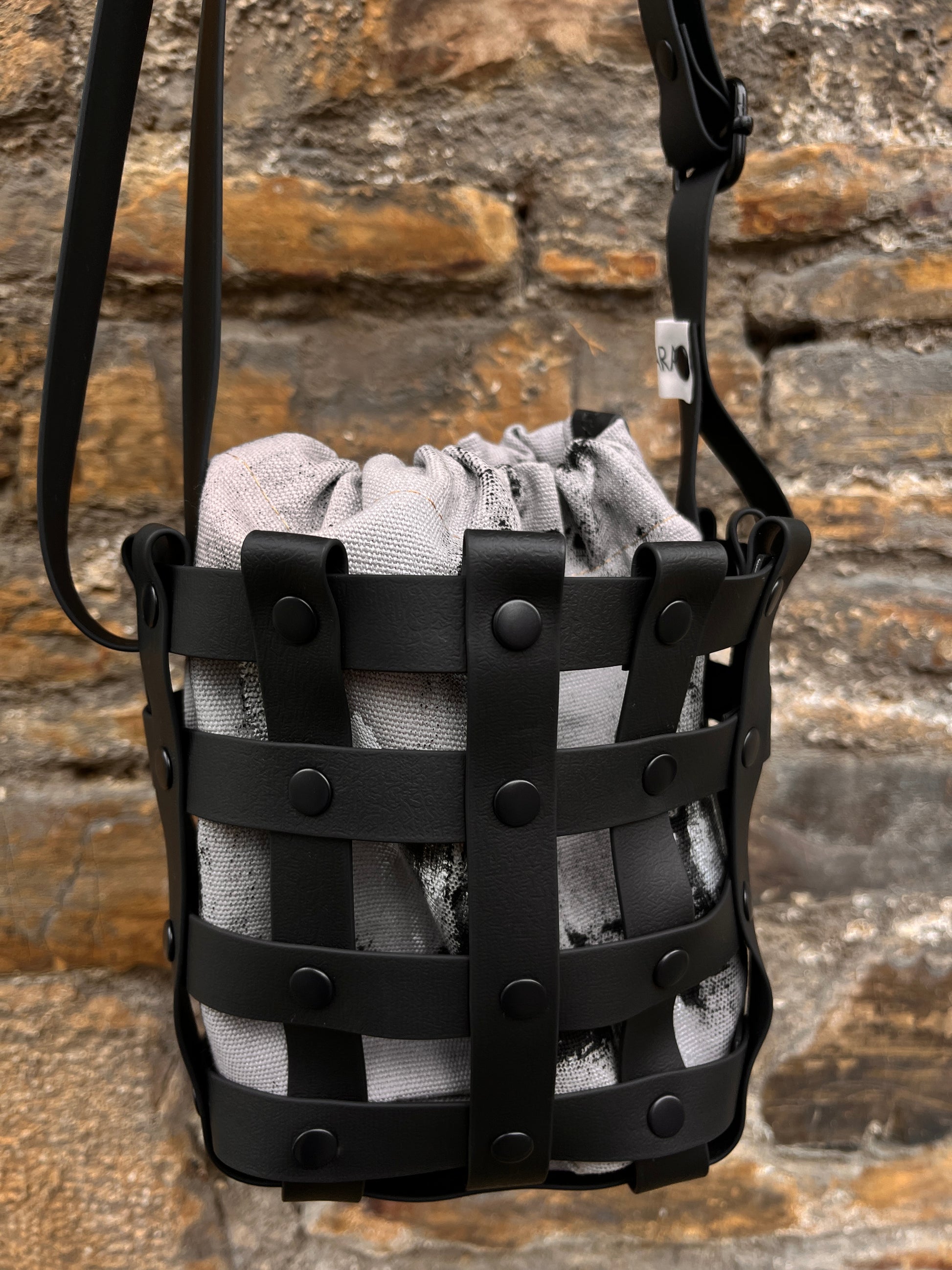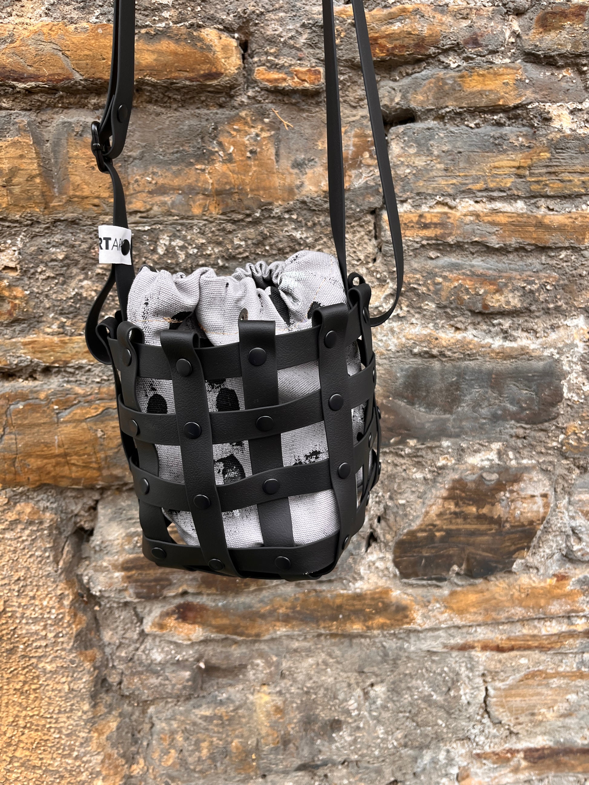 Este bolso no pasa desapercibido. Su estructura está formada por tiras negras e impermeables entrelazadas y rematadas con remaches metálicos en negro. Dentro, un saquito de algodón orgánico pintado a mano aporta el alma: cada trazo es único, cada bolso es irrepetible.