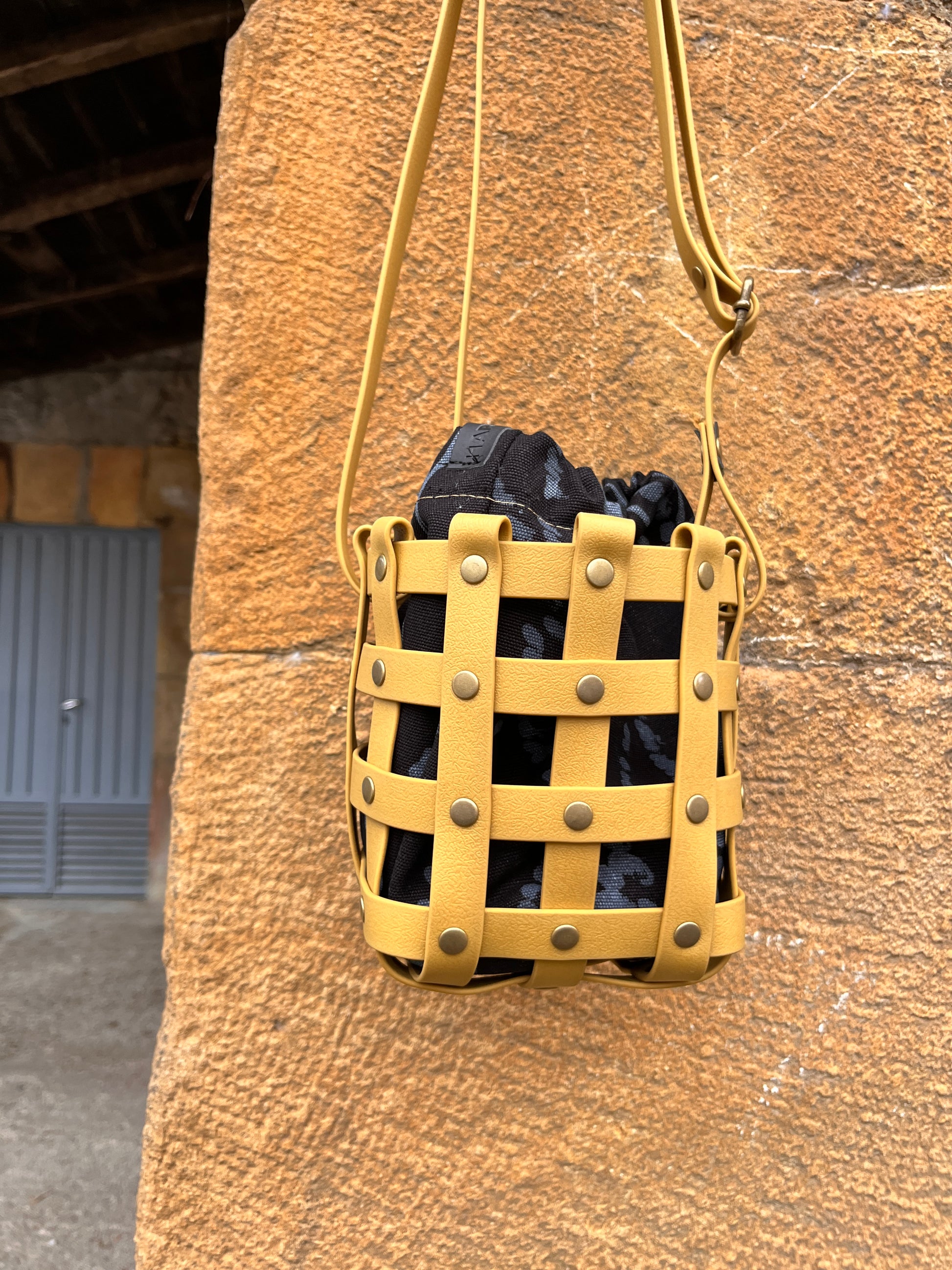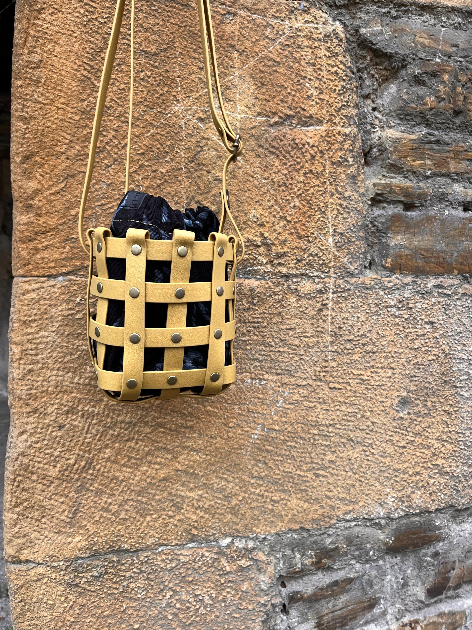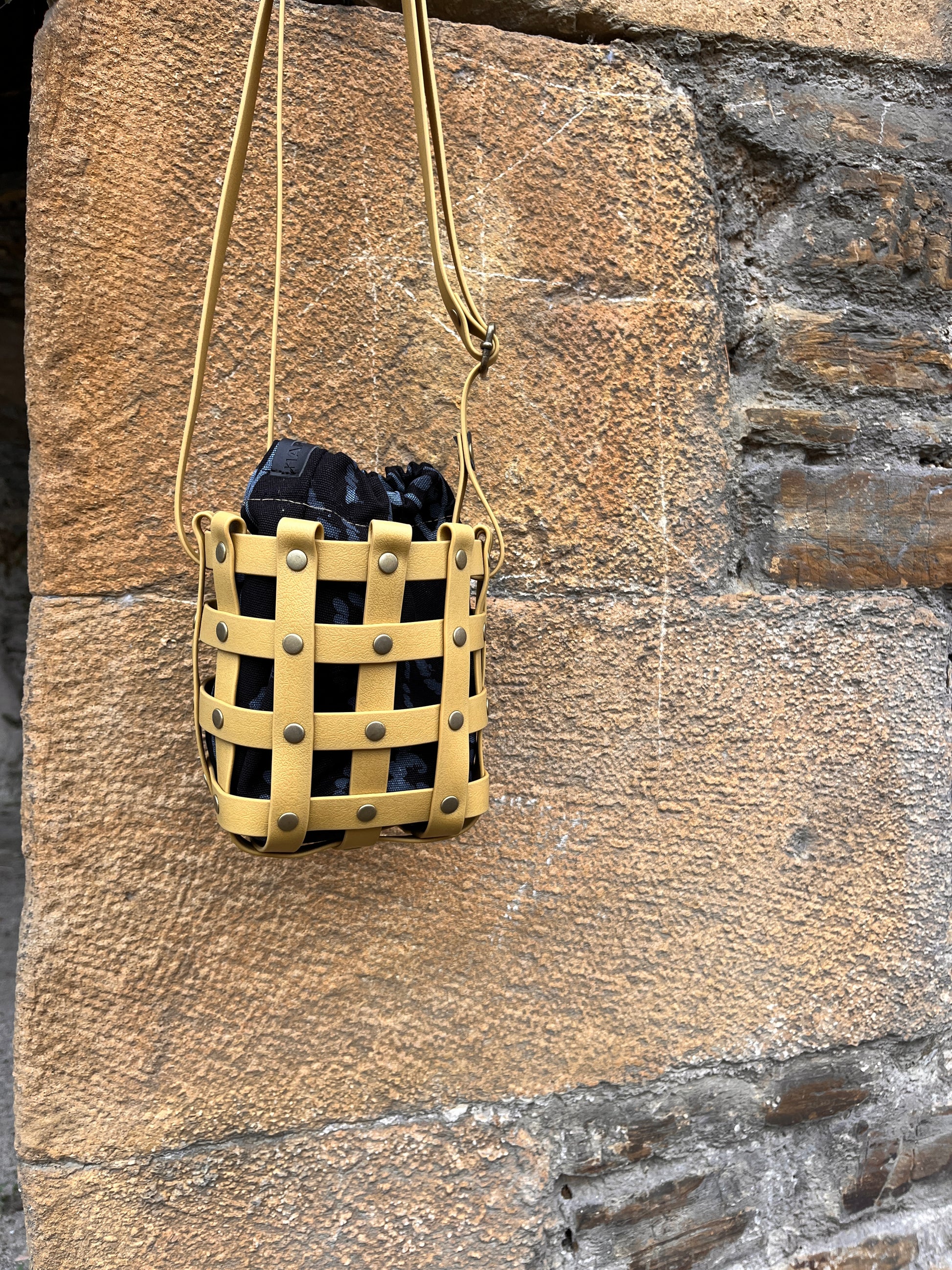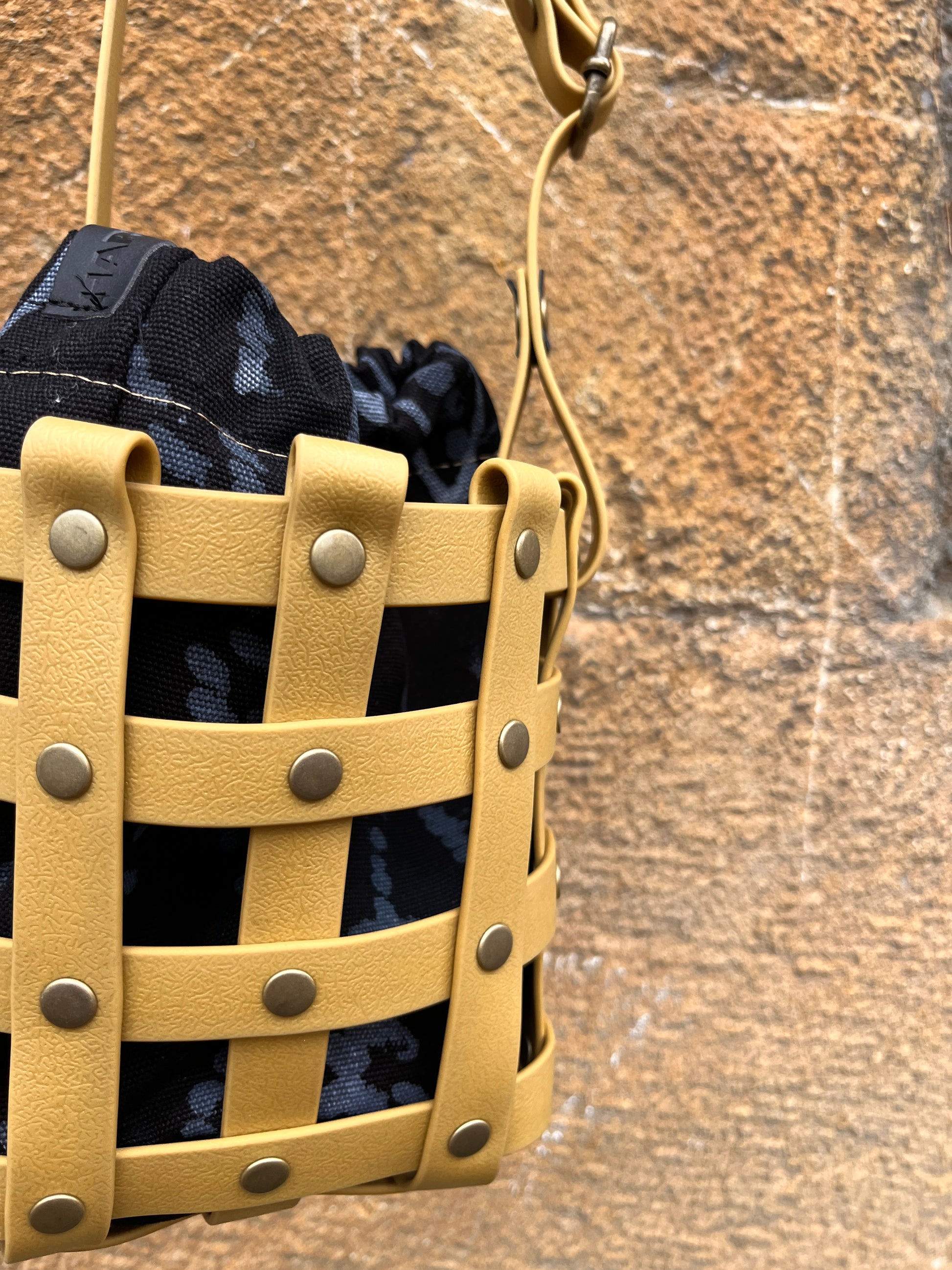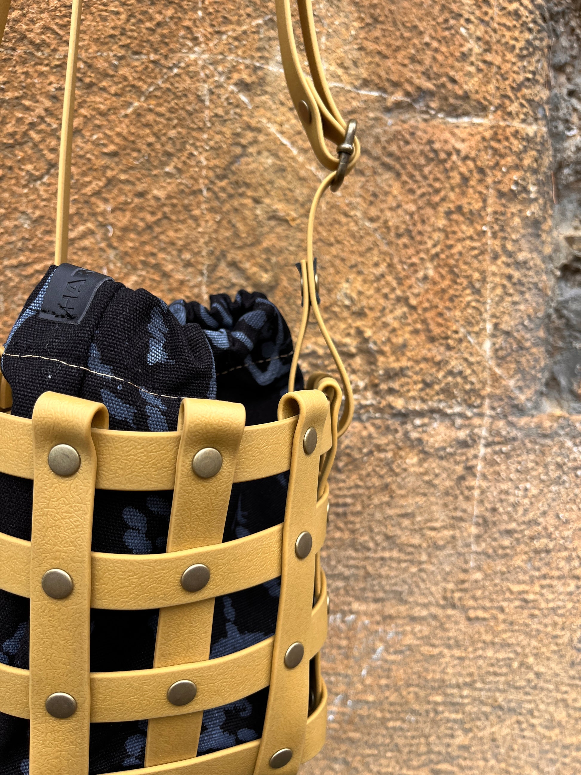 Este bolso no pasa desapercibido. Su estructura está formada por tiras negras e impermeables entrelazadas y rematadas con remaches metálicos en negro. Dentro, un saquito de algodón orgánico pintado a mano aporta el alma: cada trazo es único, cada bolso es irrepetible.