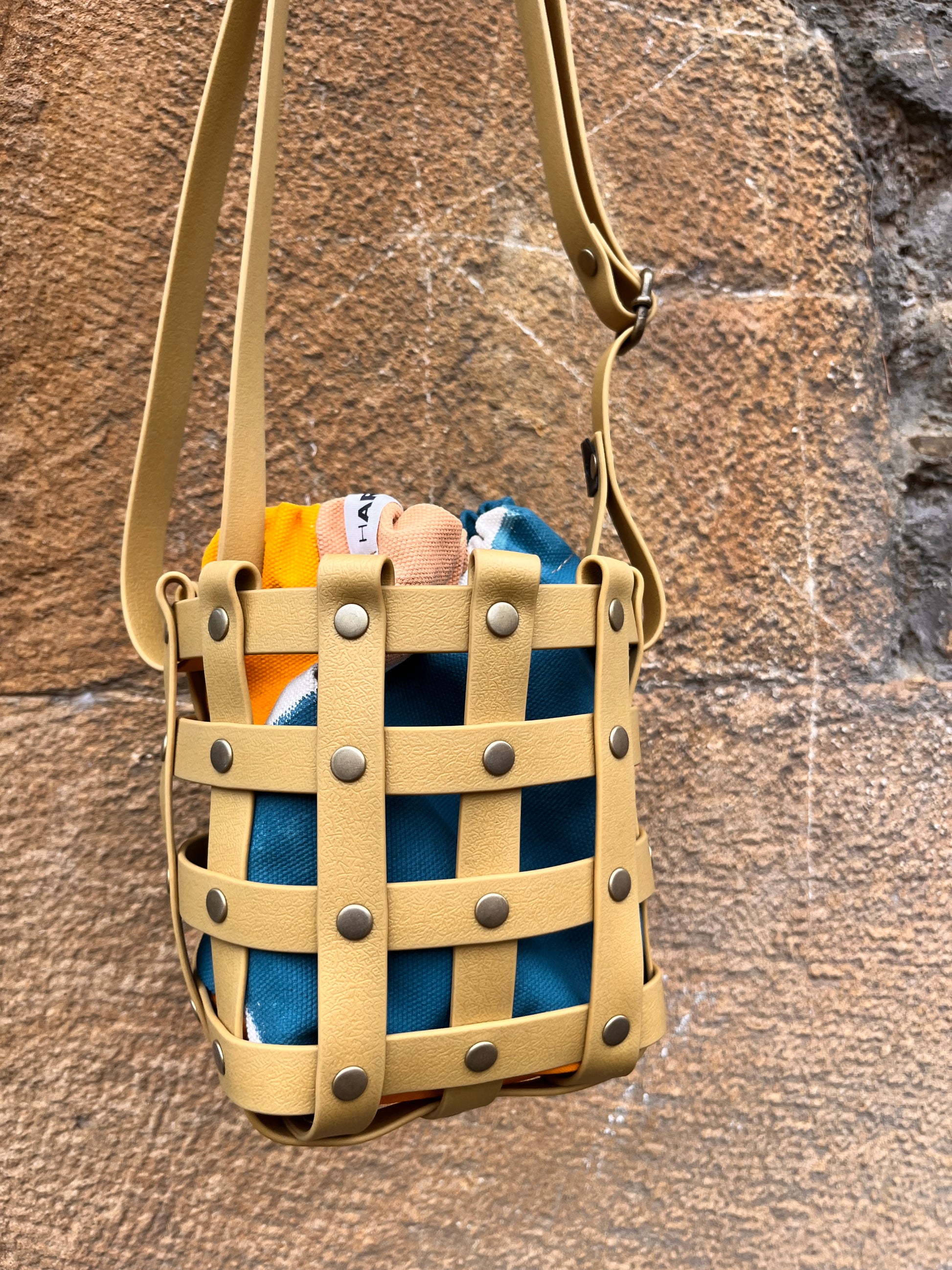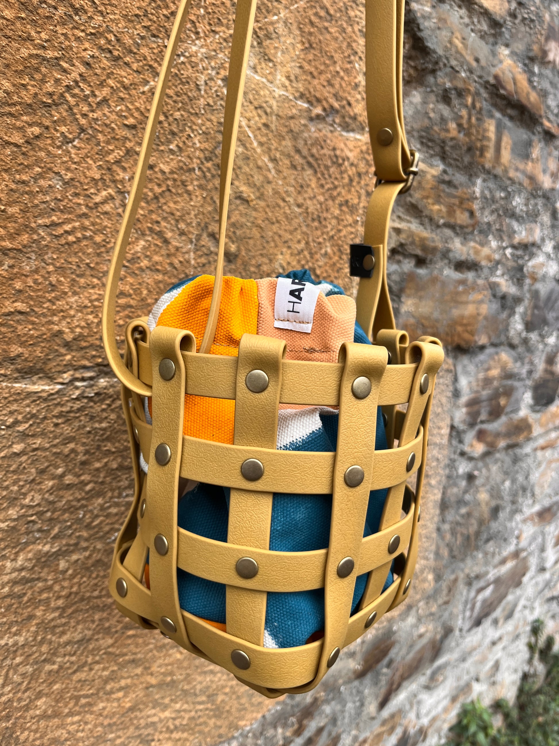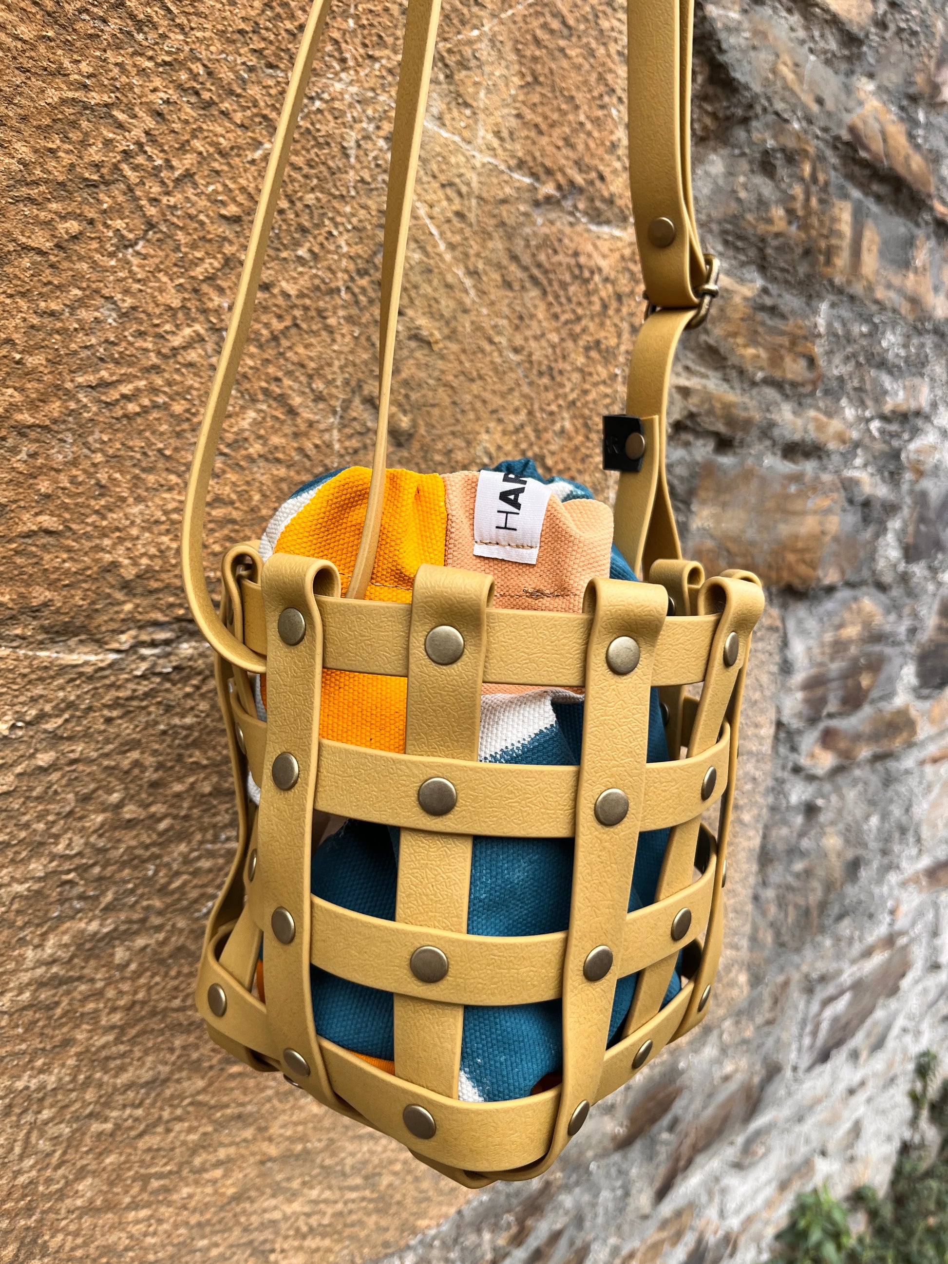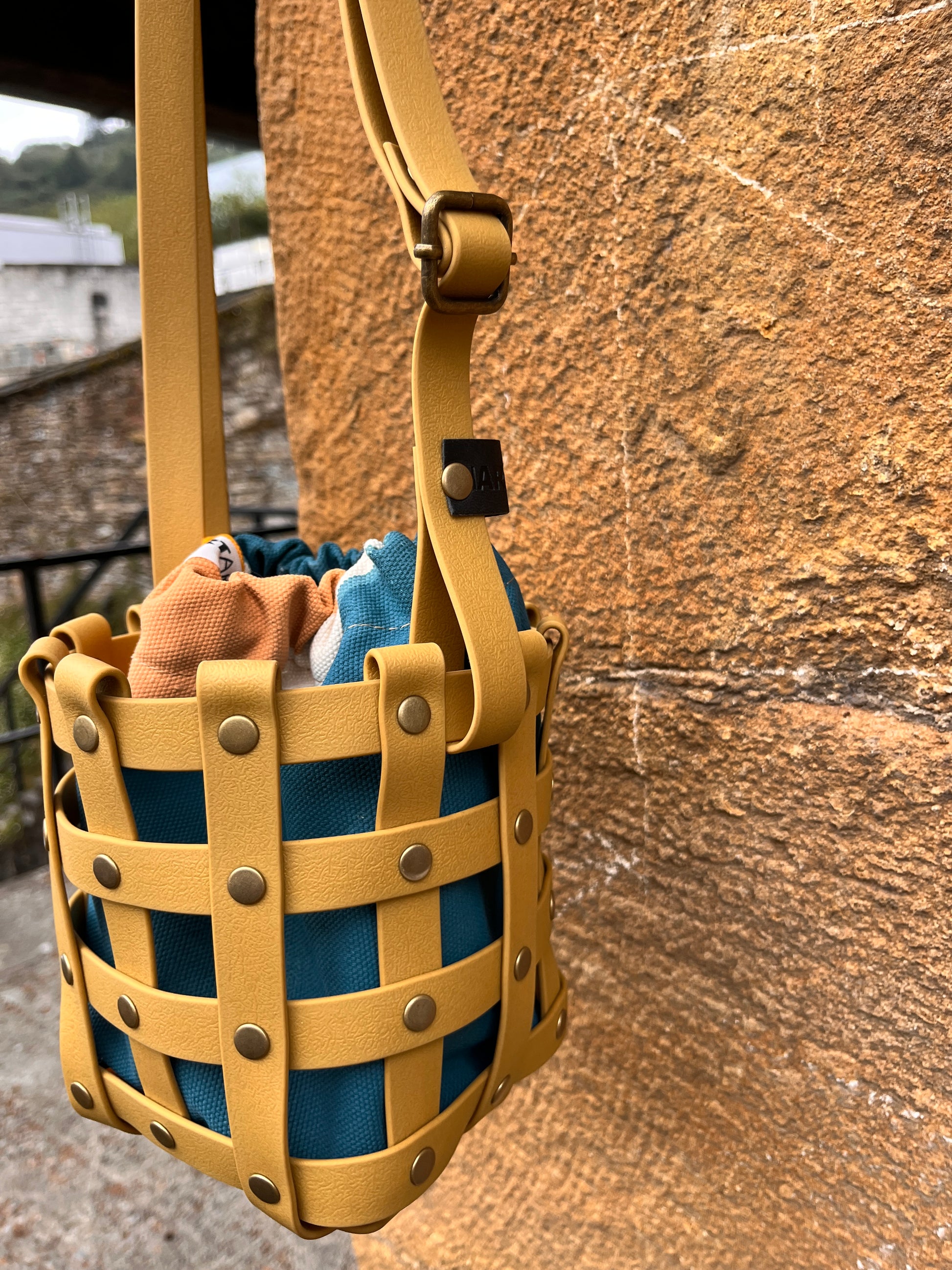Este bolso no pasa desapercibido. Su estructura está formada por tiras negras e impermeables entrelazadas y rematadas con remaches metálicos en negro. Dentro, un saquito de algodón orgánico pintado a mano aporta el alma: cada trazo es único, cada bolso es irrepetible.
