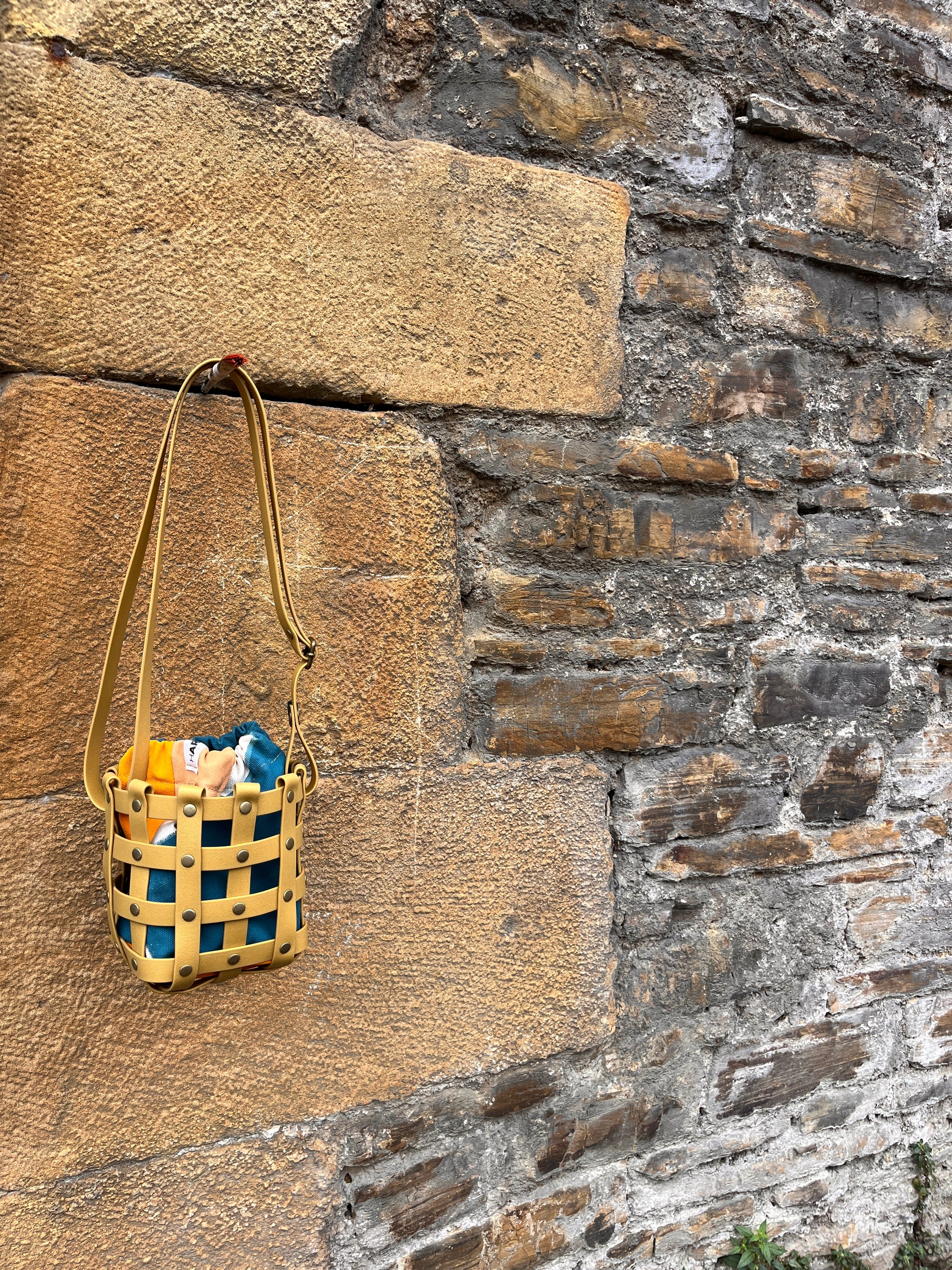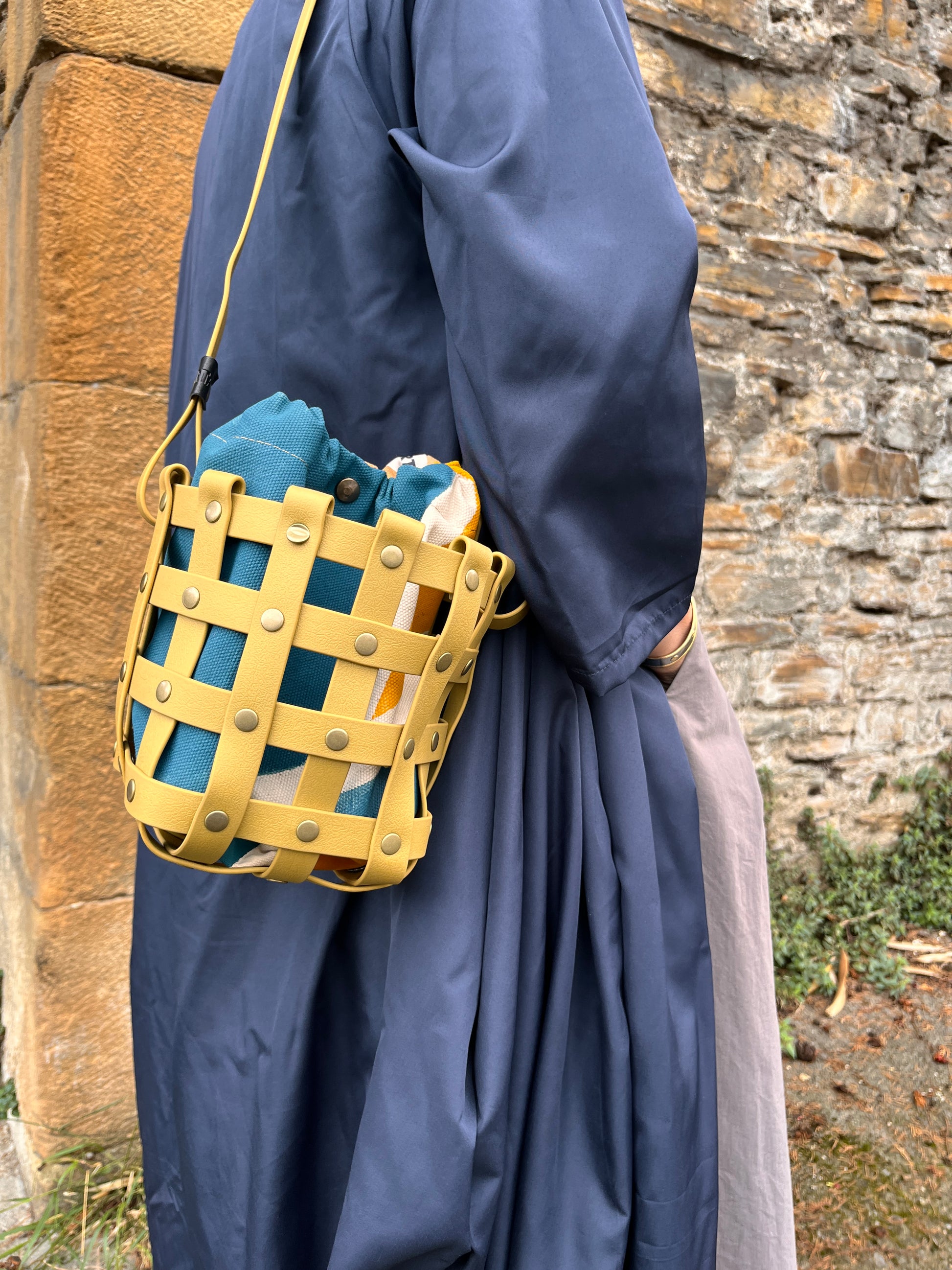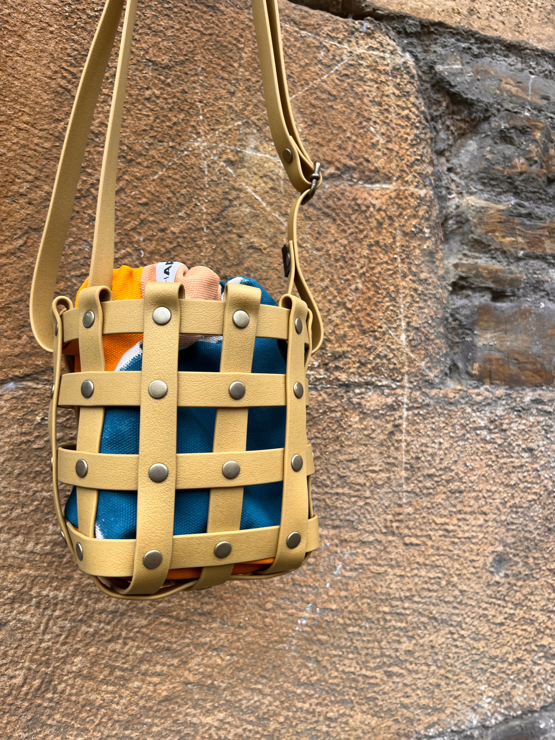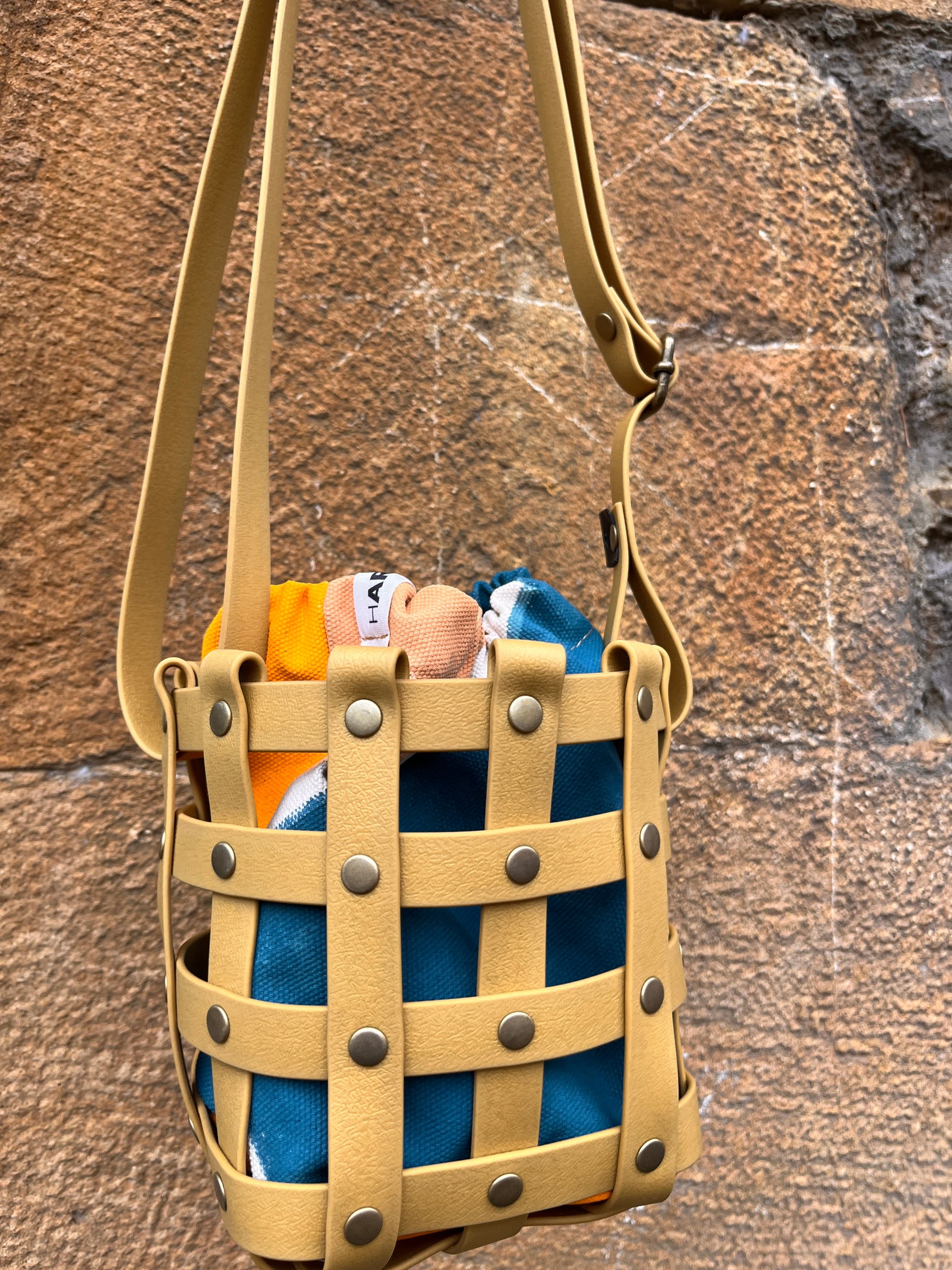 Este bolso no pasa desapercibido. Su estructura está formada por tiras negras e impermeables entrelazadas y rematadas con remaches metálicos en negro. Dentro, un saquito de algodón orgánico pintado a mano aporta el alma: cada trazo es único, cada bolso es irrepetible.