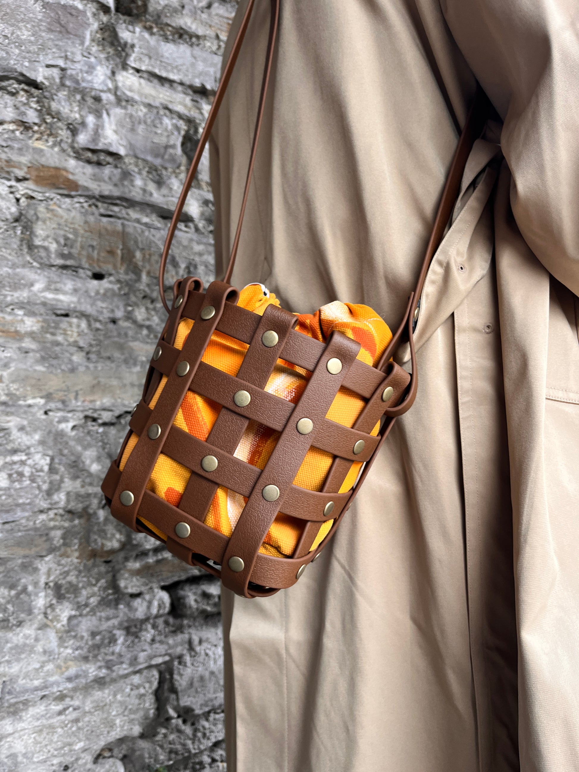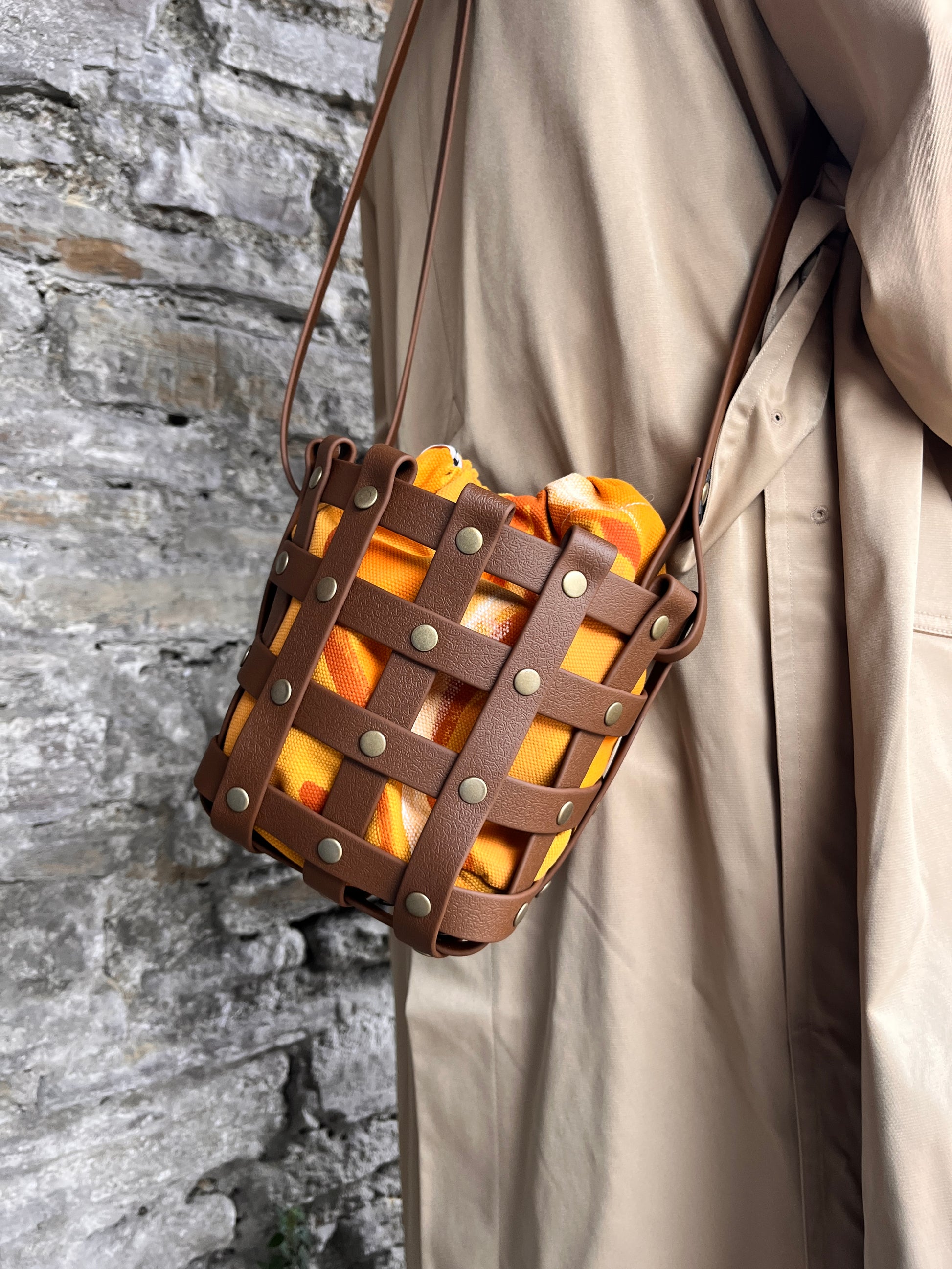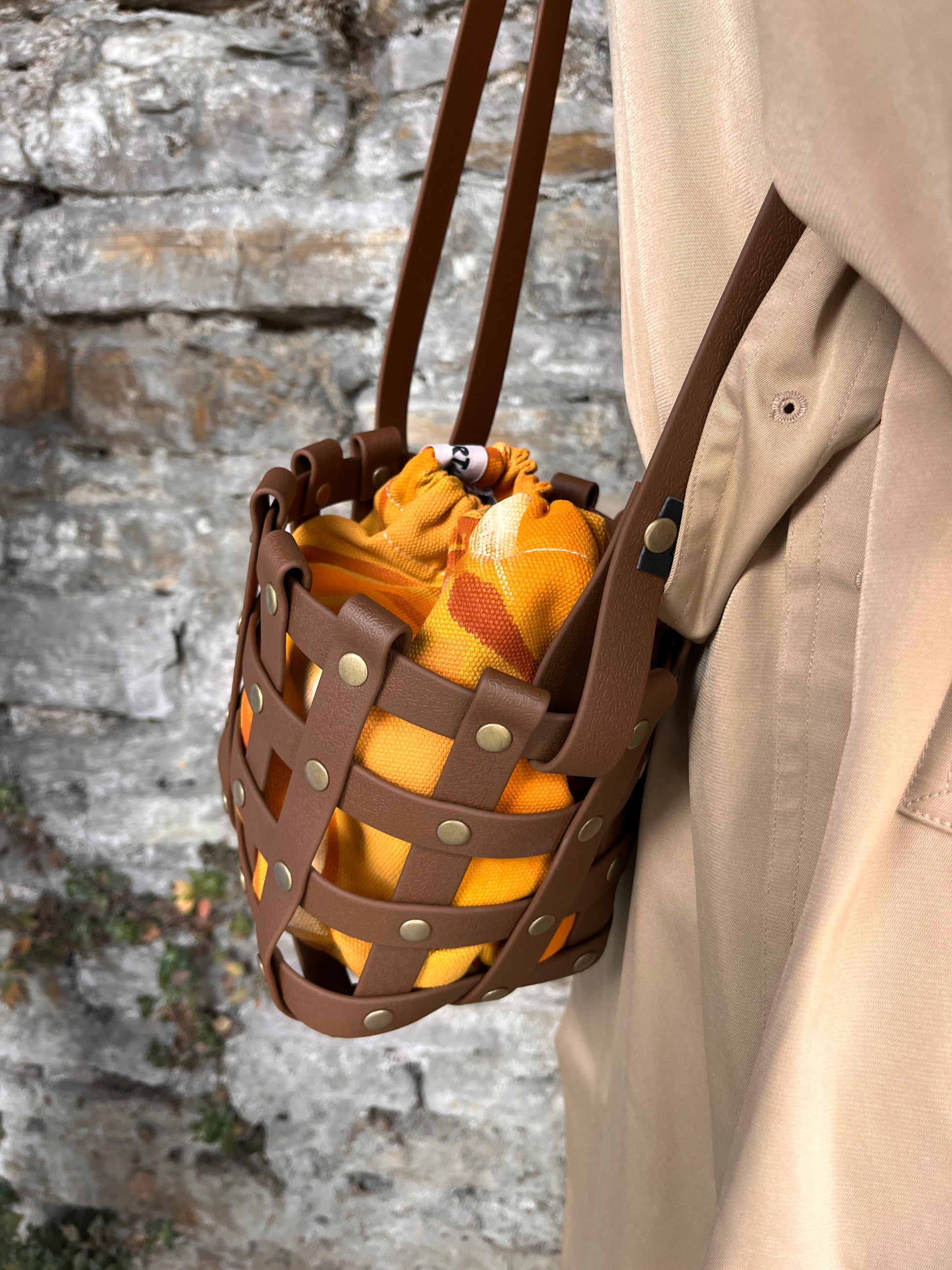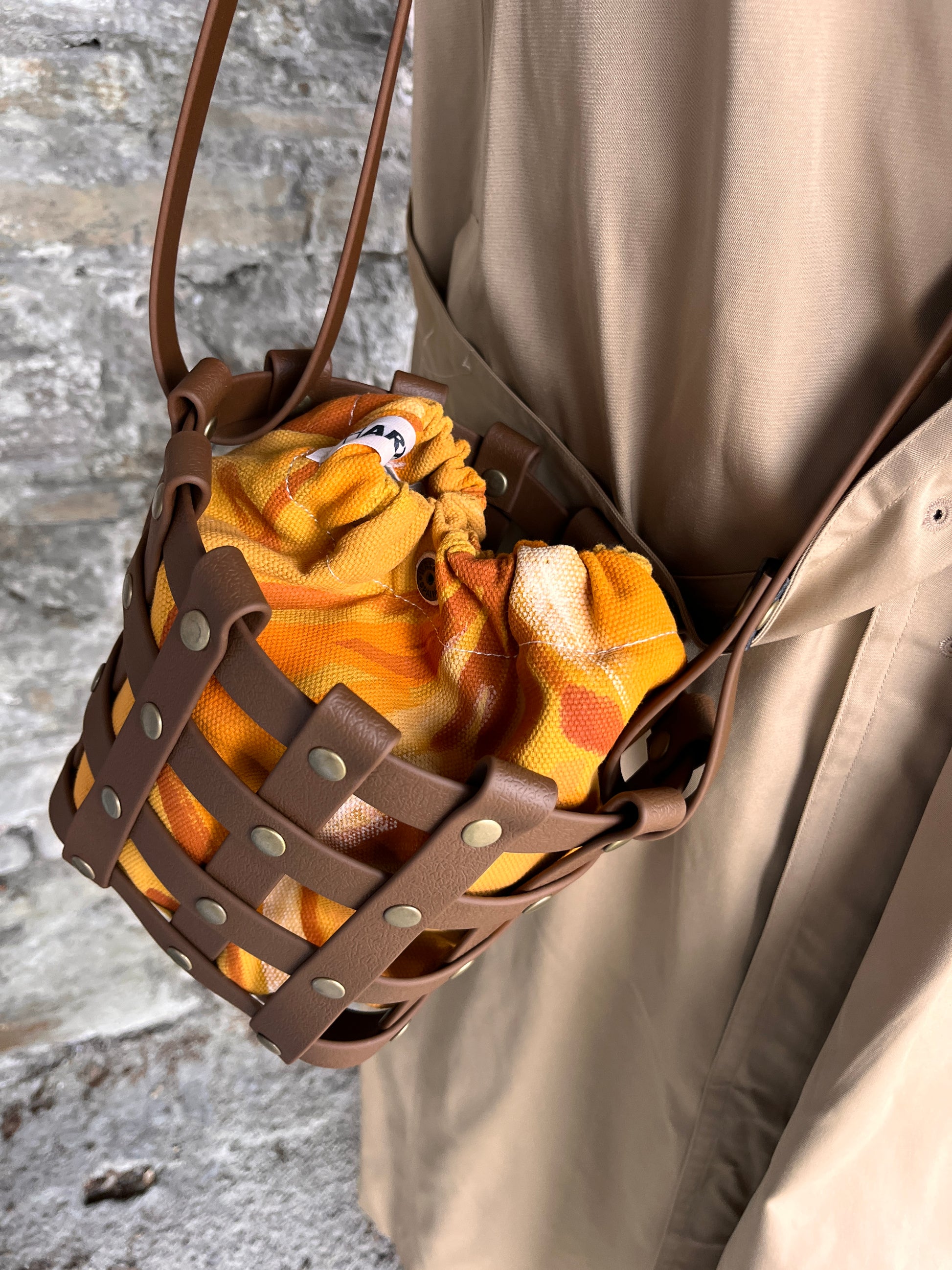 Este bolso no pasa desapercibido. Su estructura está formada por tiras negras e impermeables entrelazadas y rematadas con remaches metálicos en negro. Dentro, un saquito de algodón orgánico pintado a mano aporta el alma: cada trazo es único, cada bolso es irrepetible.