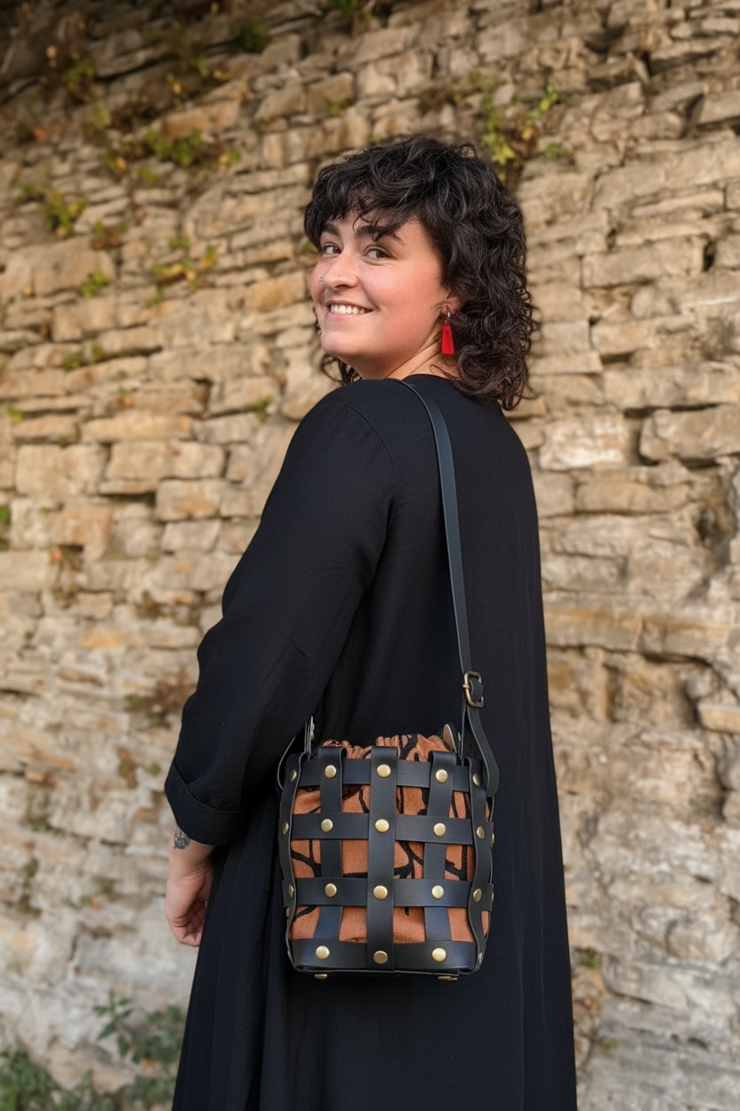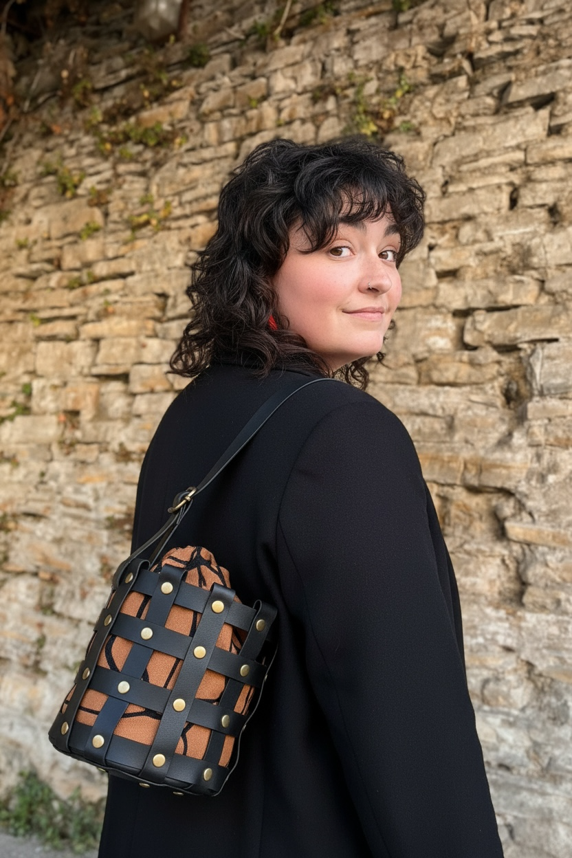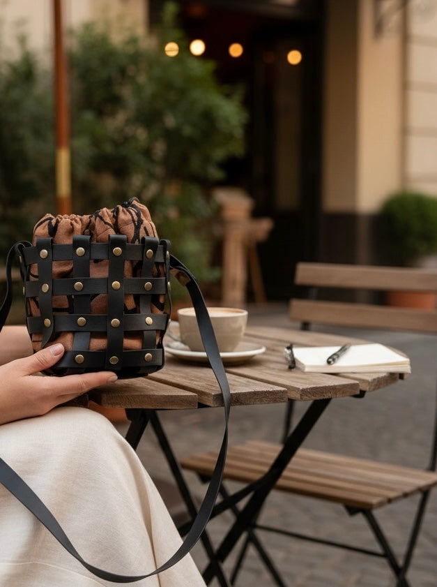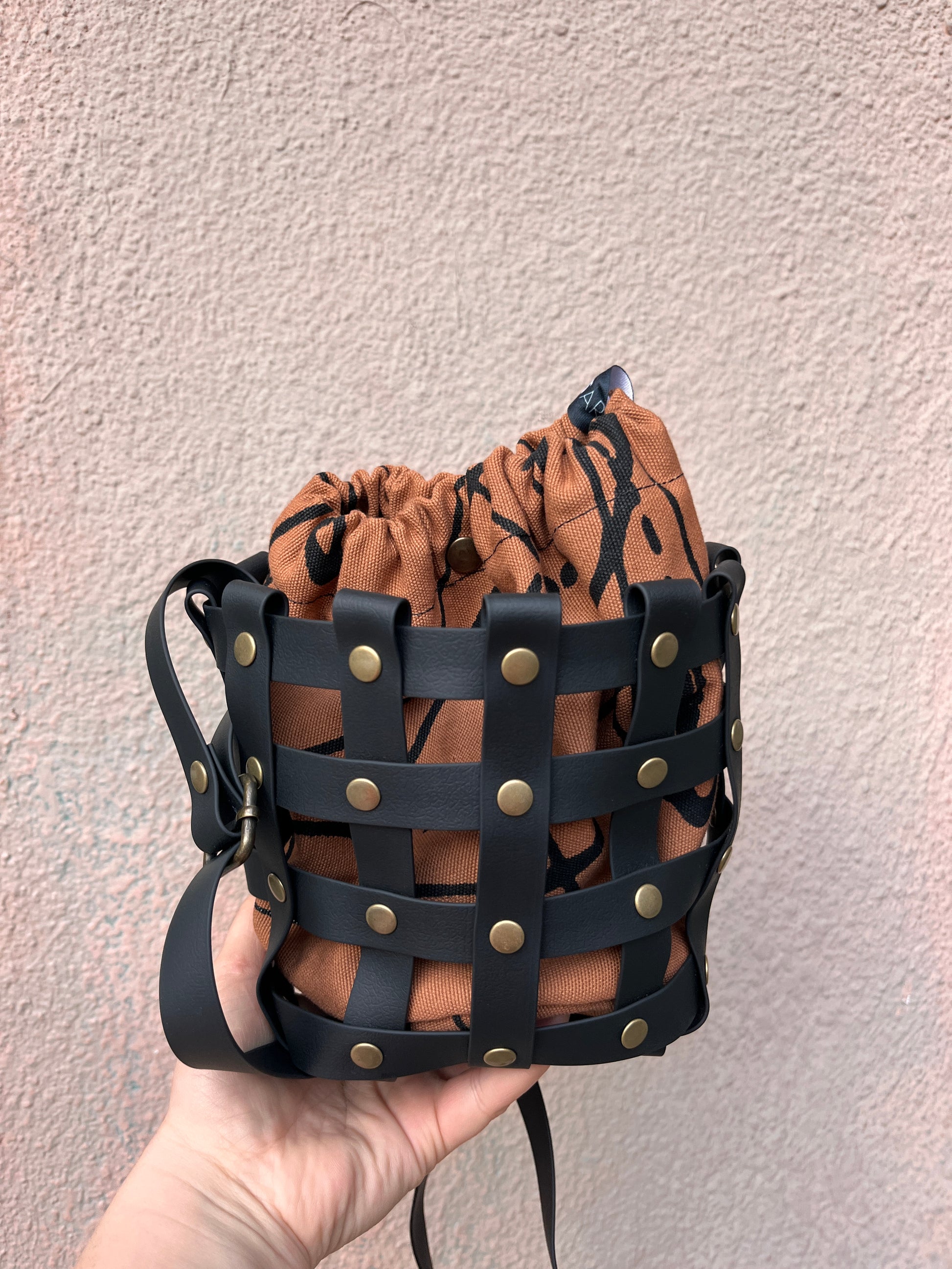 Este bolso no pasa desapercibido. Su estructura está formada por tiras negras e impermeables entrelazadas y rematadas con remaches metálicos en negro. Dentro, un saquito de algodón orgánico pintado a mano aporta el alma: cada trazo es único, cada bolso es irrepetible.