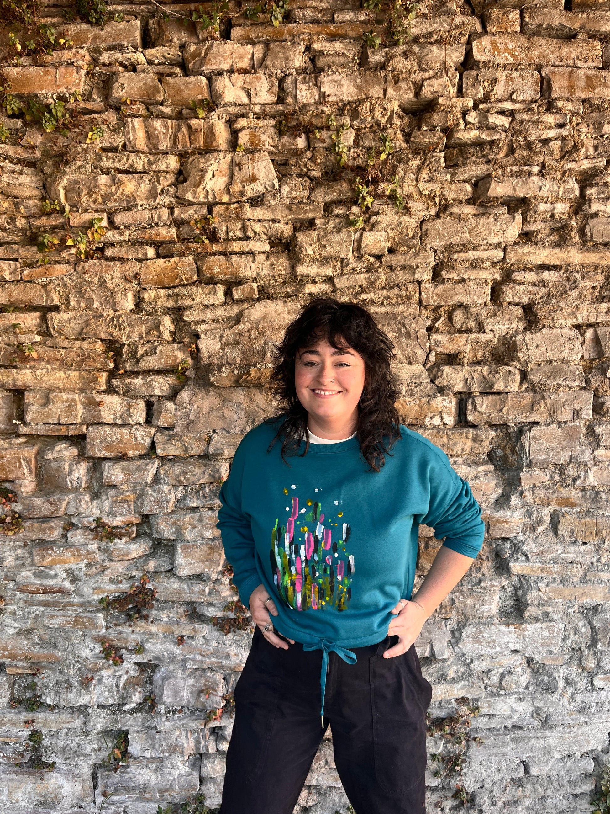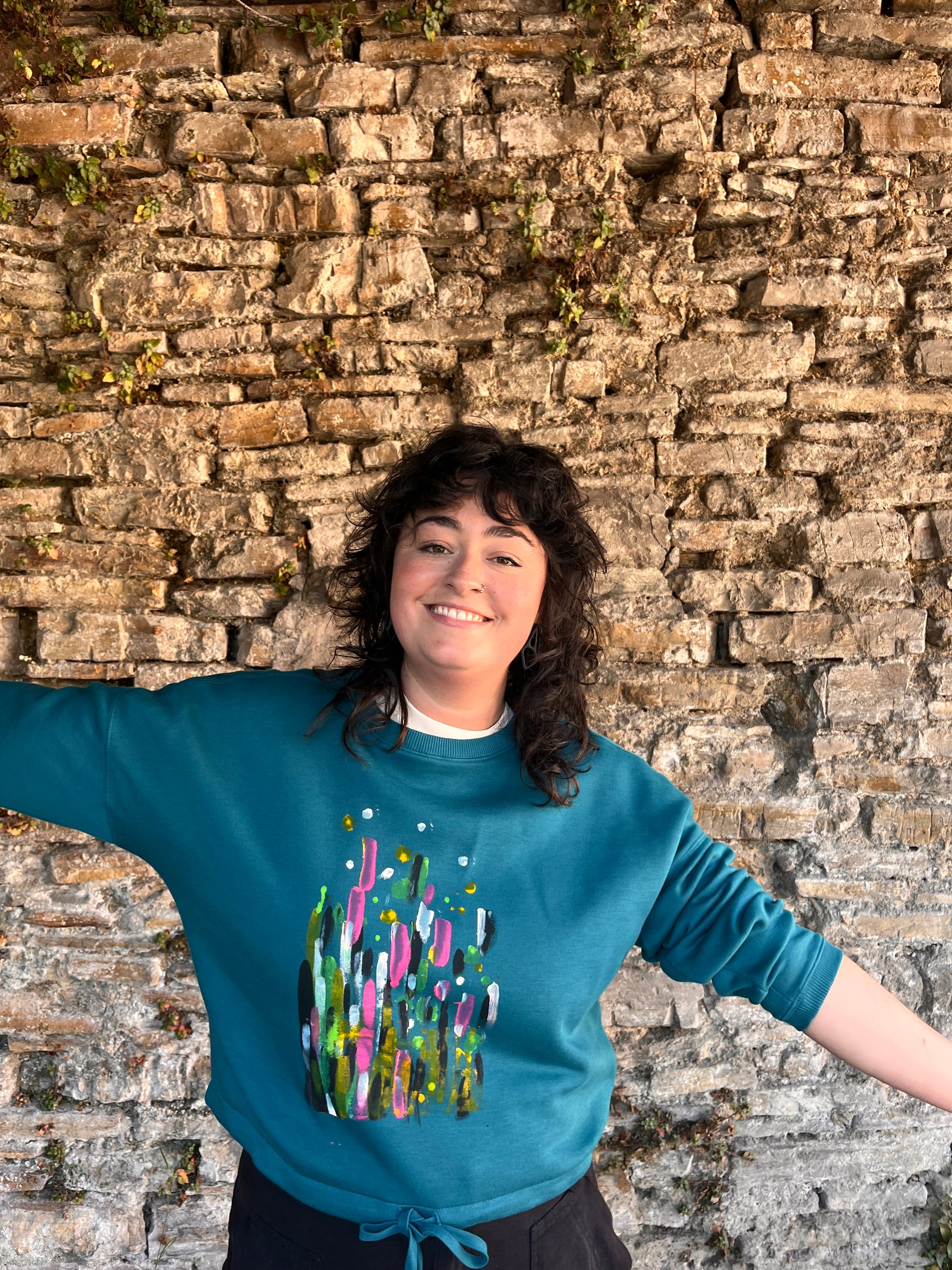 Esta sudadera corta y de corte amplio (crop oversize) combina comodidad y estilo en una silueta desenfadada que realza cualquier look. Cada una está pintada a mano con mimo, lo que la convierte en una pieza única e irrepetible.