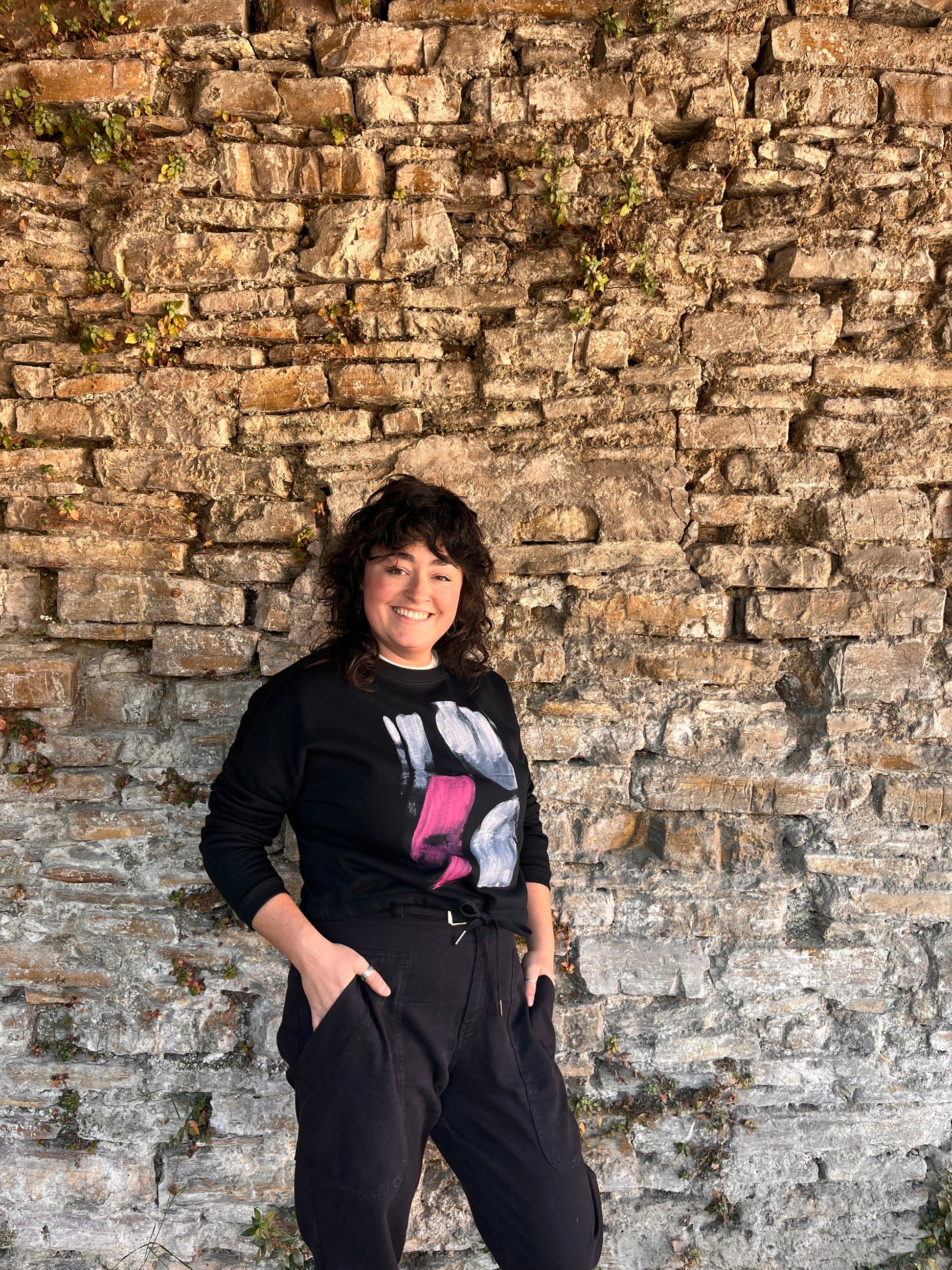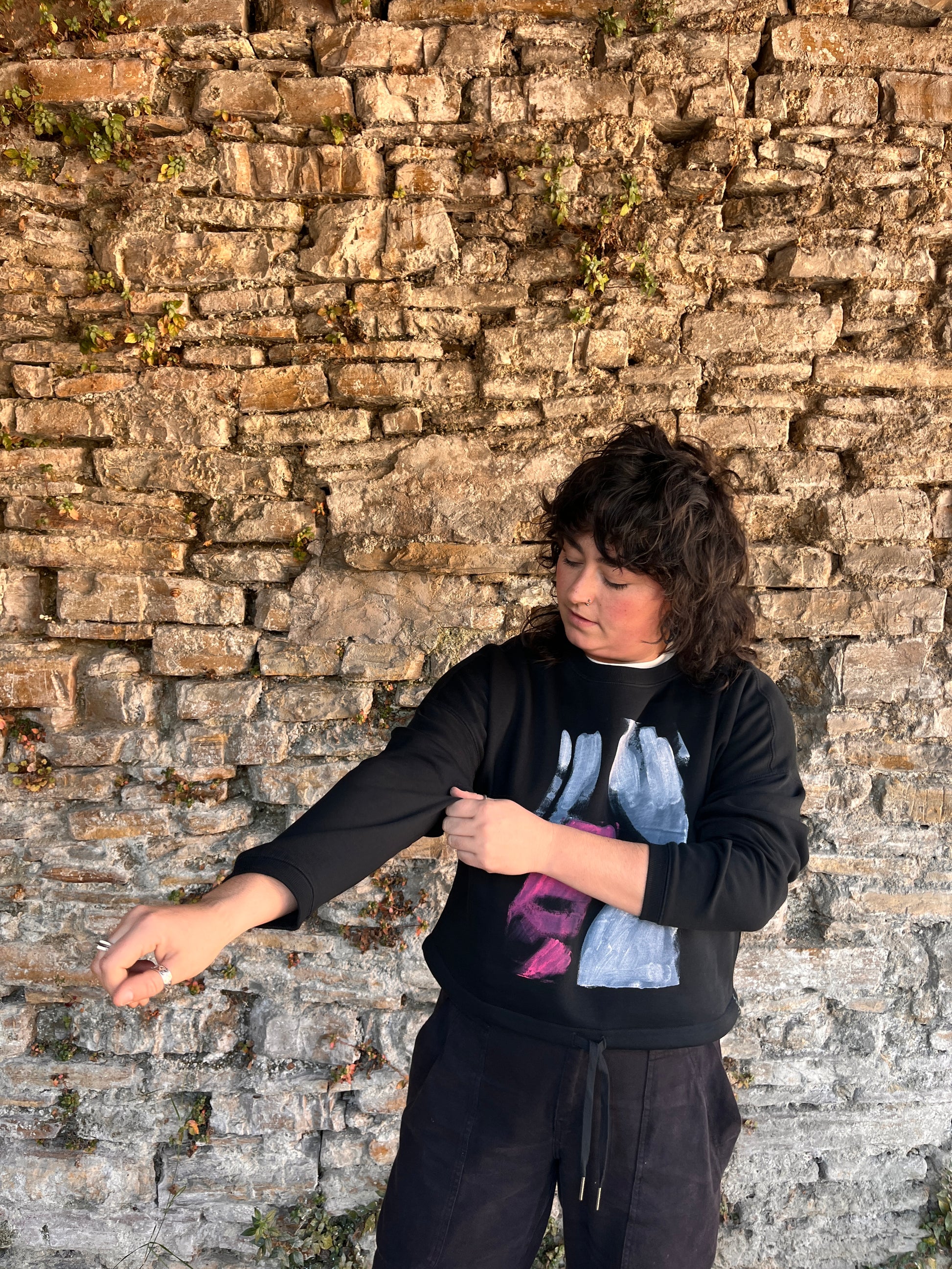 Esta sudadera corta y de corte amplio (crop oversize) combina comodidad y estilo en una silueta desenfadada que realza cualquier look. Cada una está pintada a mano con mimo, lo que la convierte en una pieza única e irrepetible.